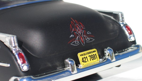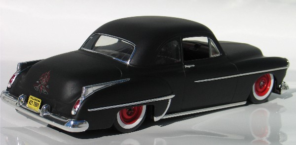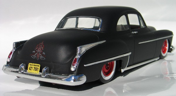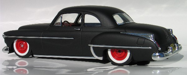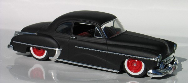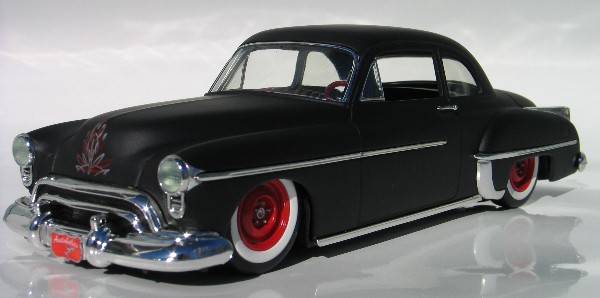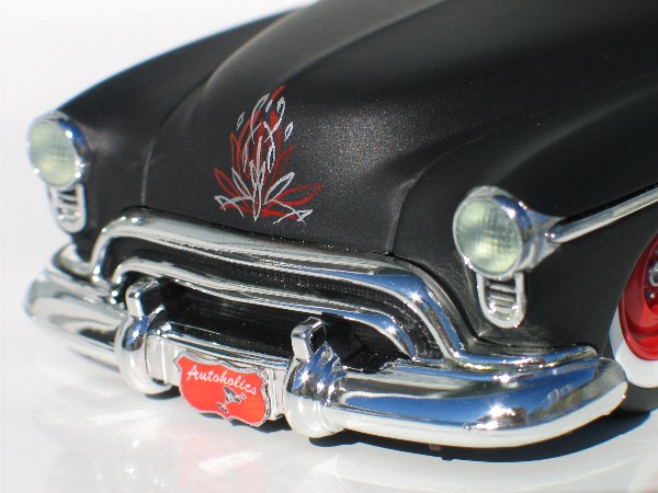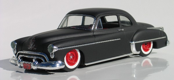 The "rat rod" aesthetic seems to have taken off over the past 2 years and I really like the look. A few years ago I built a primered Chevy SSR model that turned out pretty cool so, I decided I would build another in the same style. I was looking through my kit collection for something appropriate to start with and then I remembered I had a die-cast Ertl '50 Olds coin bank that was ripe for a rebuild. A few years ago I stumbled across it at a discount store for only $5.00. Usually, these cars trade hands for around 20 bucks but this particular version had been painted in a truly ugly green and yellow New York Jets NFL paint scene. Sometimes, you can find a some great modeling material if you can loo beyound it's humble beginnings. First, I carefully disassembled the car. Then the original paint was stripped by soaking the body in lacquer thinner. Afterward, the body was then given some mild customizing. The hood and trunk trim was removed and filled for a smoother look. Since this die-cast was originally a coin bank, there was a large coin slot in the trunk that was also filled in. A nice thing about this kit was that the chrome trim pieces were all separate plated plastic parts, but they were a little thick and stood out too far from the body. I carefully scraped the back side with an x-acto blade until they where thin enough to look more realistic. After the bodywork was finished, I painted the body using Krylon flat black right from the spray can. An authentic "rat rod" touch! Next, I hand painted the "Von Dutch" style pinstripes on the hood and deck lid. The interior was painted testors gloss red that was then weathered with various paint washes and pastel chalk dust to make it look old and well used. The model was then re-assembled and then chassis was modified so the car would sit with a "down in the weeds" look. The white walls and steel wheels came from my parts box. Other details include an "Autoholics" car club plaque on the front which I made from a picture I found on the web and a vintage California rear license plate which I made on the computer.