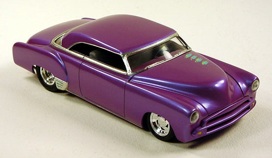 1951 Chevy Bel Air Lead Sled - (built 1990) I built this AMT '51 Chevy Bel Air model kit as a lead sled, but I decided to make it a little different from the norm. Usually, lead sleds are they are just for slow cruising. I decided to build my custom with a little more "go-fast" attitude! So, the Bel Air sits with a rake and big meats in the back. It features a chopped top with the vent windows removed and the windshield laid back. The Chevy's body has been nosed, decked and smoothed. Also the headlights are molded in for a flush look. The bumpers were removed and custom roll pans were blended in. The paint is Tamiya metallic purple. I also dry brushed some brush stroke style graphics on to the hood which were all the rage back in the early '90's when I built this model. This model was pictured in Street Rodder, Custom Rodder, and Plastic Fanatic magazines.