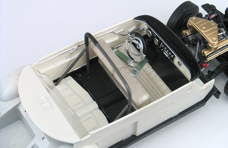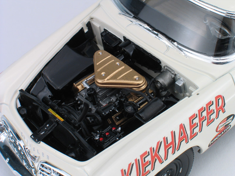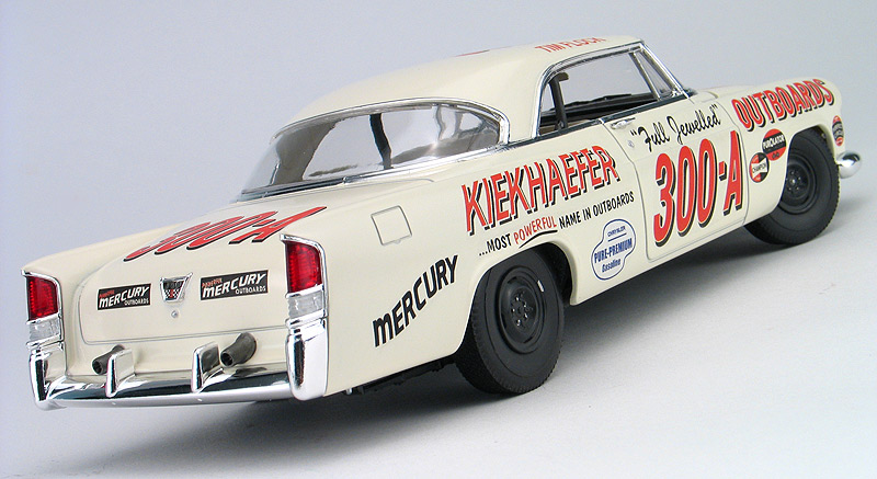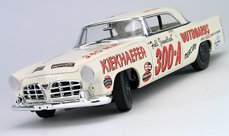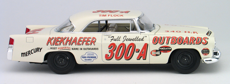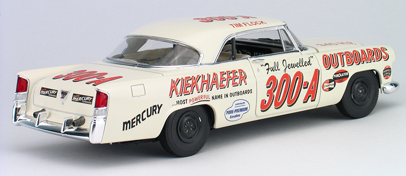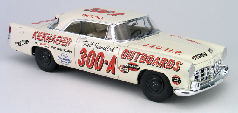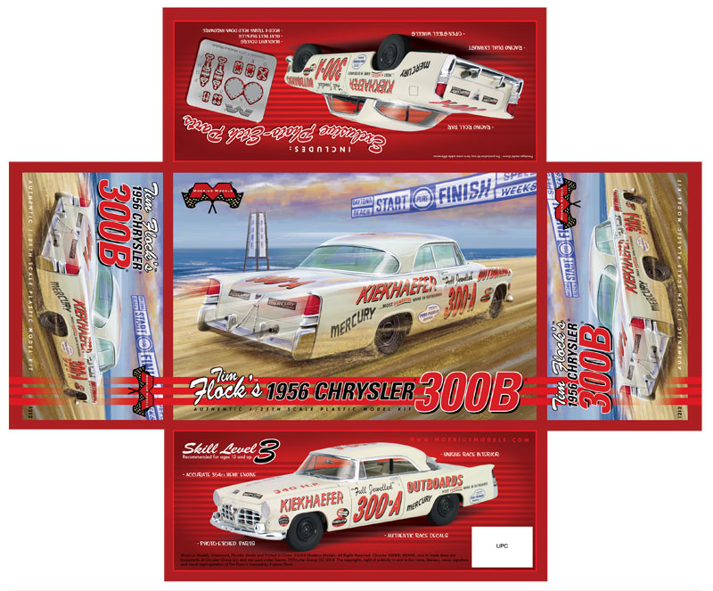 Moebius Tim Flock 1956 Chrysler 300B race car model kit packaging artist - (built 2014) As an artist for the model kit industry, I've done several box art package designs for Moebius Models. Another design I did was for packaging for the Tim Flock '56 Chrysler 300B race car model kit. I created the box top illustration, box design, built the display model shown below and shot all the photography. This model kit is a 1/25th plastic replica of the car Tim Flock drove during the 1st part of the 1956 NASCAR racing season. 1955 was a record setting year for Tim Flock and the Chrysler 300, winning 19 poles and 18 victories in 45 races. The 1956 season, started off well for Flock driving the new and improved Chrysler 300B. The '56 300B featured a bigger 354 c.i. Hemi and 55 more horsepower. Tim Flock won the spring Daytona beach race. However, 1956 was filled with off-track frustration with team owner Carl Kiekhaefer. Despite their combined on-track success, Flock left Kiekhaefer's team immediately after his victory in the April 8th race at North Wilkesboro, North Carolina, citing stomach ulcers. Buck Baker also drove an identical car for the Keikhaefer team in '56 and won the '56 championship in the 300B. I built the photo model from a pre-production test shot kit. This kit requires some modifications to the body to make an accurate race car. The body came in the kit as a factory stock car. To make it a race car, I had to remove the front headlight buckets and sand off the side body moldings. The kit includes some photoetched metal parts for headlight covers and hold/trunk tie-downs. Those parts were not ready at the I built my model, so I head to make my own headlight covers from styrene. I omitted the tie-down straps. Also, you may notice that I left off front suspension parts loose on my model so I could leave the front wheels poseable. Hang me on your wall!