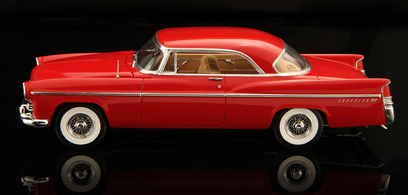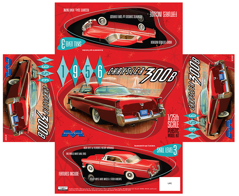 As an artist for the model kit industry, I've done several box art package designs for Moebius Models. One of my favorites has to be this package design for the stock '56 Chrysler 300B kit. I created the box top illustration, box design, built the display model shown below and shot all the photography. The illustration (above) was hand drawn and painted in Photoshop using a Wacom monitor and stylis. I built the model from a pre-production test shot kit. As you can see it was missing some of the final engraving for the emblems. Also, I built the model with different wheels on both sides to show the optional parts included in the kit.