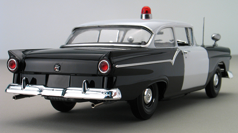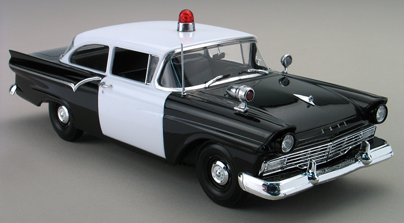 1957 Ford Custom Police Car - Model King / Revell box art project (built 2013) In late 2012, I was asked by Model King to create the box art for a special issue of the new Revell '57 Ford Custom sedan kit. Apparently, when the new tooling was done for the kit they also created some vintage police car parts and Model King was able to get the rights to issue a special limited edition run with the new police car parts added. I was really excited to work on this project because I love old police cars and I had been wanting to a do a box art illustration with a night scene. A police car with all the lights blaring would be just the ticket. (Pun intended.) The illustration shown above was painted by hand using a Wacom monitor in Photoshop CS6. I wanted the illustration to have a '50's era car advertising Gouache painting feel to it. It's a little different from the other box art illustrations I've done in the past, but it's appropriate to the time period. The kit features a unique siren, beacon light, spotlight, antenna and police radio not found in the regular Revell 2n1 kit. In addition to the illustration, I also built the sample model below which is featured in photography on the sides of the box. The model was built straight from the box. I also collaborated on the decal sheet design with Dave Van and the design team at Revell. It features a bevy of both fictional and authentic agency graphics. Production decals were not available at the time when I built the model, so I simply Photoshopped the police graphics on in these photos. The kit should be available sometime around spring 2013.