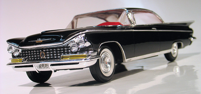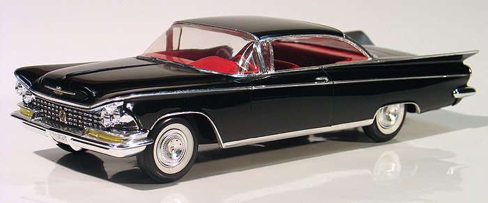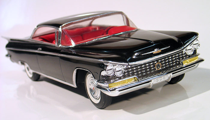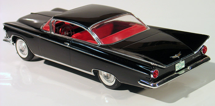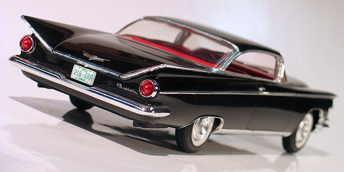 1959 Buick Invicta- (built 1991) I built this AMT 1959 Buick Invicta around 1992. I restored it from a built-up model that I bought from a fellow Buckeye Scale Auto Club member. It was a Craftsman kit and when I got it, it was in excellent condition. It had been put together without glue and was only held together by the chassis screws. Luckily it was also unpainted but the chrome was rather dull. After disassembly, I carefully removed all the mold lines from the bumpers and had all the chrome replated at Chrome-Tech. These cars always reminded me of the Batmobile, so I thought a black paint job would be appropriate. For paint I shot the body with Testor's gloss back sprayed right from the can. After drying it was polished up with a Micro-Mesh polishing kit.