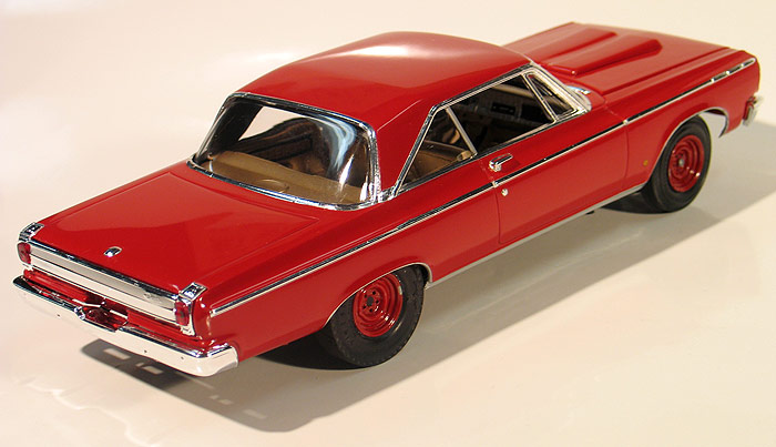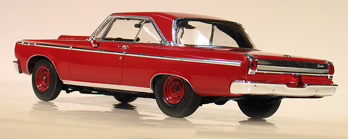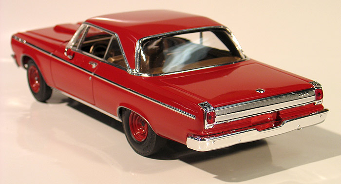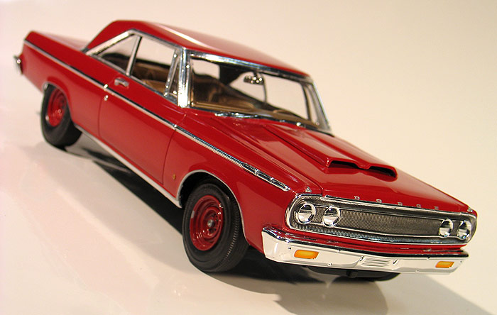 1965 Dodge Coronet - (built 2006) Here is my built version of the Polar Lights 1965 Dodge Coronet. It's a pretty easy kit to build. Basically, the kit comes with the body pre-painted and all you have to do is just assembly it. I wanted to keep this a simple shelf piece, but I did add a few details to make it a little more realistic looking. First, I polished out and waxed the factory paint job and then covered all the trim with bare metal foil. Second, the interior is molded in a light tan color that seemed to lack realism. I ended up painting it with a custom light gold color that I made by mixing silver and gold together. I wanted to give the car a "sixties super stock drag racing" look. So, I dug through my parts box and found a set of vintage drag slicks and some better looking front tires. To those I added a set of steel wheels from a Johan '64 Dodge kit. I got luckily and was able to match the red paint of the body by mixing a little black into some Testor's gloss red. I then finished the look by adjusting the front suspension so I set with a little "nose up" look that a lot of those cars had.