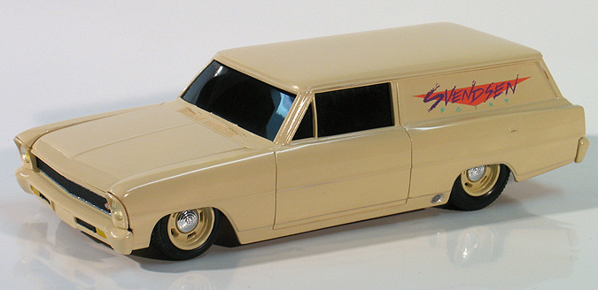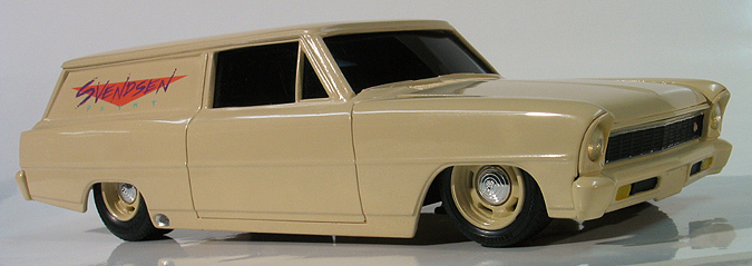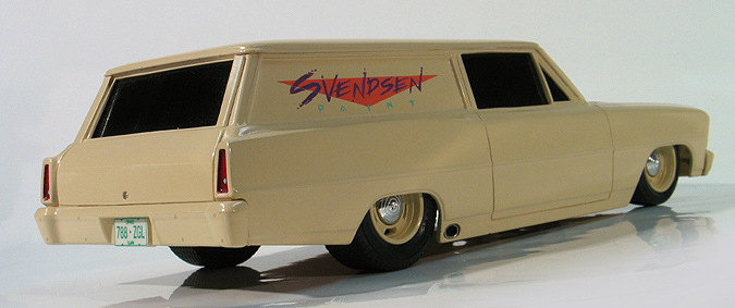 This phantom '66 Chevy II Nova sedan delivery wagon was built using a Mike's Miniature Motors resin body and the AMT/Ertl 1966 Chevorlet Nova SS kit. Back at the time I built this model, most guys were building these as tubbed out pro street cars, so I decided to do something a bit different. My concept for the Nova was to build it as if it were a shop truck for a paint and body shop. Like something a custom painter might drive.