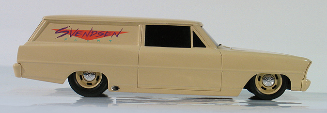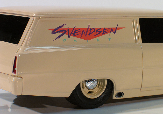 For color I decided to do something a little out of the ordinary and painted the Nova in a solid gloss tan color. It's a Testors color and it was shot using a spray bomb and then polished out with a Micro Mesh polishing kit. The "Svendsen Paint" logos on the side panels were painted on by hand. My hands were a lot more steady back then.