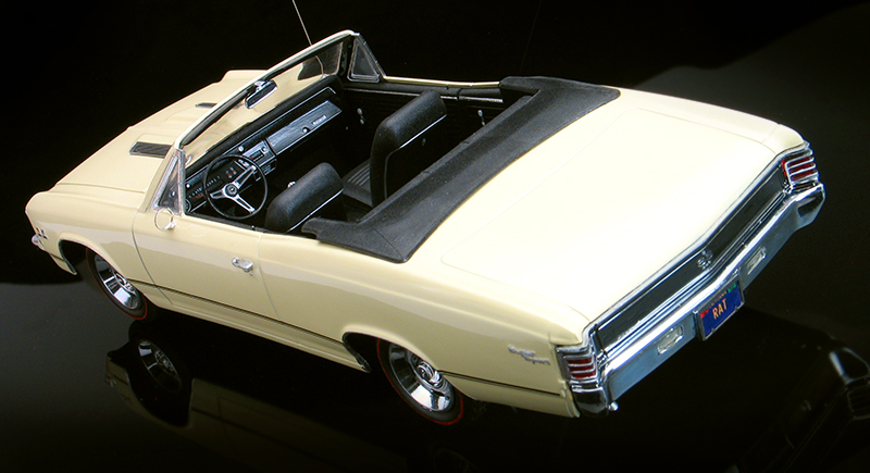 In addition to the convertible mod, I also added a couple of other things to add some extra detail to the model. The door handles were drilled out for a little more realism. I added door locks to the interior. I also added photo-etched license plate frames and an antenna. The redline tires were hand painted using a ruling pen and a compass.