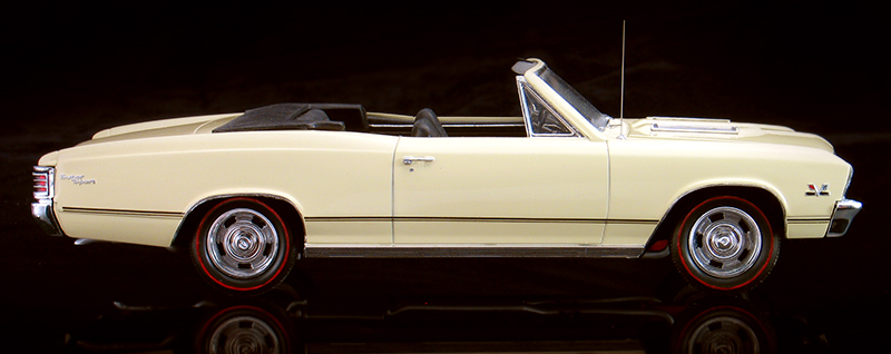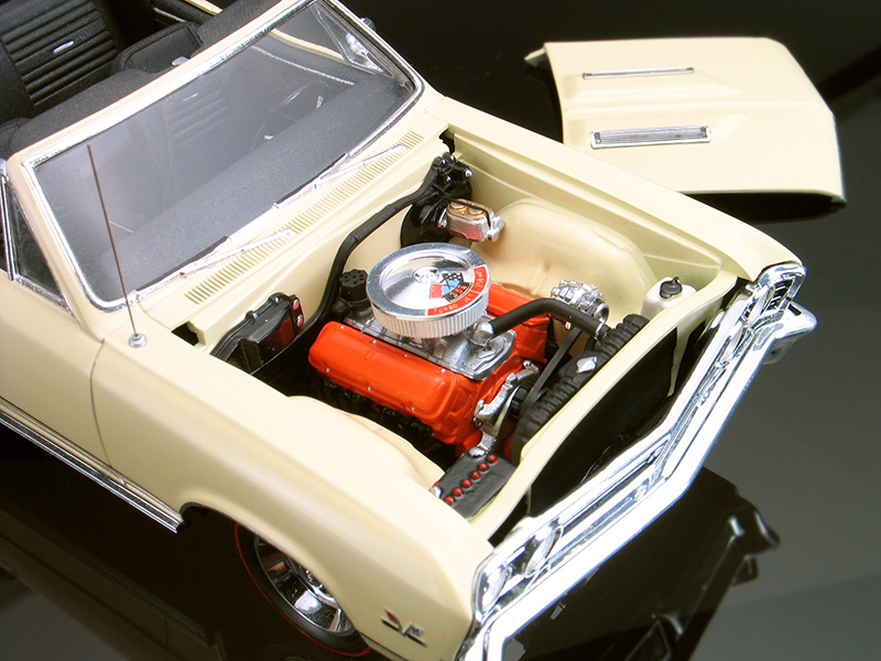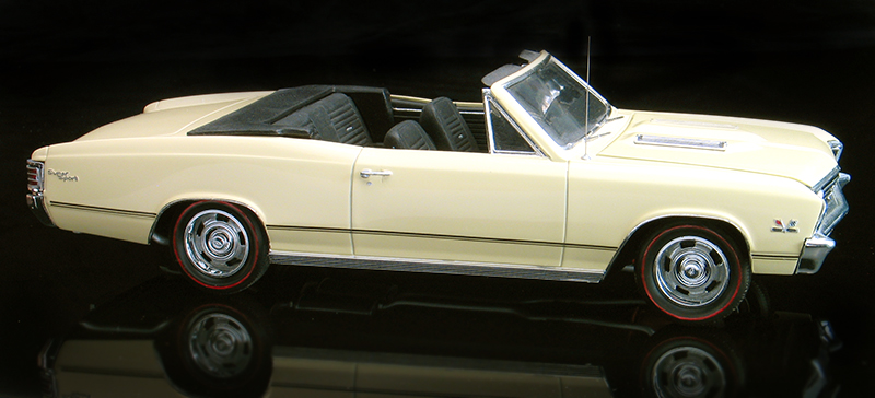 My grand father owned a real '67 Camaro painted in Buttercup Yellow. Chevelles were also available in that color and I've also liked that it, so I obtained a spray can of matching factory Chevrolet Buttercup Yellow touch up paint and painted with that. Afterward, the paint was wet sanded with 8000 grit paper and hand polished to a mirror finish with Micro Glaze compound. I recently pulled my Chevelle out of show case to do some repair work on it and re-photograph it for this web site. It's held up pretty well over the years, but along the way the driver's side lower trim has gone missing. Since I've had this Chevelle in my collection, it has traveled across many states and was exhibited in many contests. It was even pictured in Plastic Fanatic magazine back in '92.