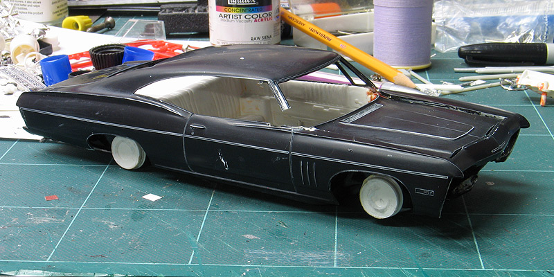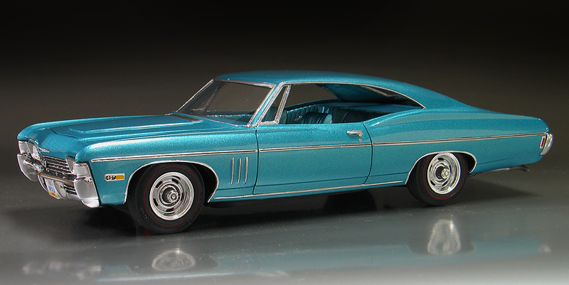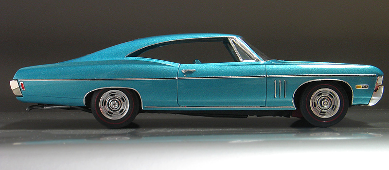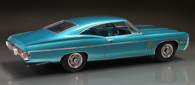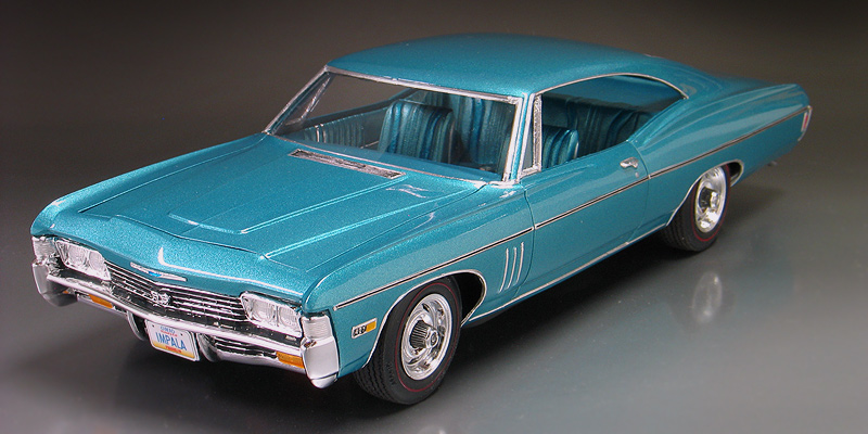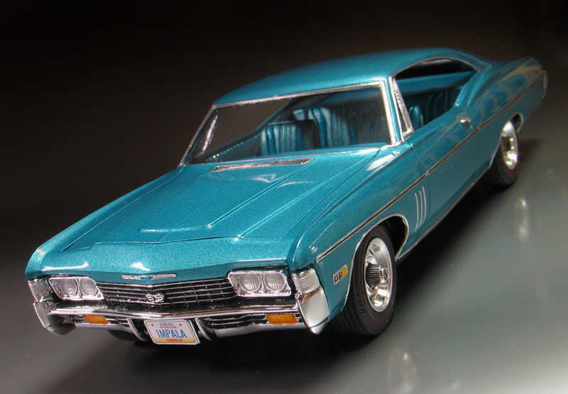 1968 Chevy Impala SS427 - (built 2012) I'm a huge fan of those big old Chevy Impalas from the '60's. I think the styling of these cars was really cool. They were big, long and had great lines to them. Over the years, I've collected a complete collection of 1/25th scale Impalas from '60-'70. Probably the rarest of them all is this MPC '68 Chevrolet Impala SS427 kit. MPC only made the 1968 kit for one year and then they were updated to the '69 model year body, so the production run was low. Now, un built examples are super hard to find and command big dollars. My Impala is a restoration project that started out as a glue bomb I bought back in the '80s. Even though it had some issues such as a broken windshield post, I jumped at the chance to buy one. Good thing I did because I rarely see them come up for sale. It sat in my model kit restoration "to-do" pile for more than 20 years until I recently decided to restore it. (I may be slow but I do eventually get around to them.) When I first got the model it was mostly complete but had a broken / missing windshield pillar and vent window on the passenger side. Also it had been spray painted black and had some glue marks on the body. The original paint was stripped by soaking it in a vat of Castrol Super Clean overnight. After repairing the body work, I painted the body in a factory matching "tropical turquoise" PPG acrylic enamel. Then it was clear coated with PPG urethane clear. The original MPC kit has the front Chevy emblem in the wrong place (look at the photo of my un restored model and you will see what I mean.) To fix it I made a foil casting of it and the removed the emblem from the body before painting. After painting I trimmed out the foil and relocated the emblem closer to the grill as it should be. The old chrome bumpers were also stripped and sent out for replating by Chrome-tech USA. The original kit's stock hubcaps were replaced with a new set of rally wheels from an AMT/Ertl '68 El-camino kit. I also added new tires from my parts box and hand painted the red lines with a ruling pen compass. Lastly, I added custom made license plates. |
