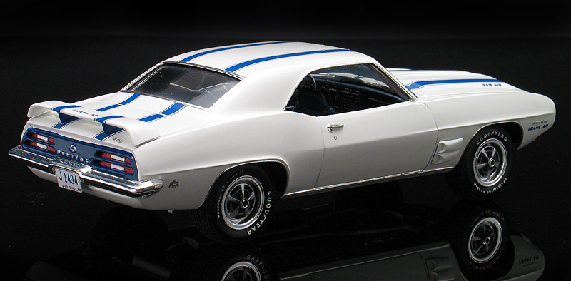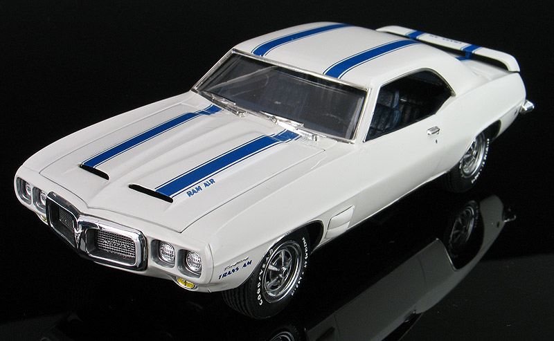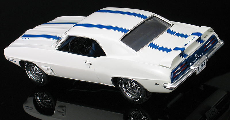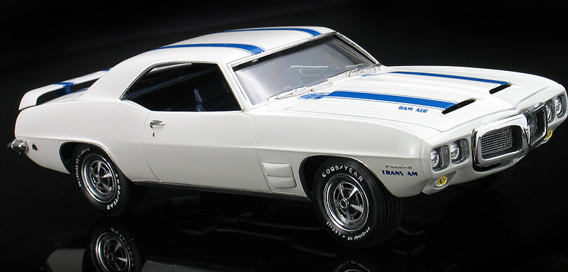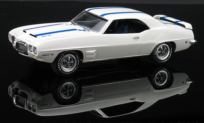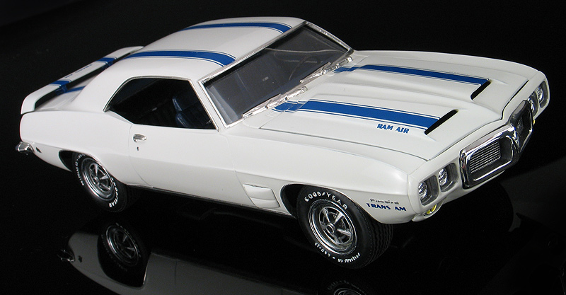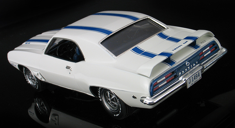 1969 Pontiac Trans Am - (built 1994) In 1969, the pony car war in full rage and the manufacturers were doing battle on race tracks across in America in the Trans Am series. The Trans-Am series was a road racing league sponsored by the SCCA and run at tracks like Road America and Mid-Ohio. Pontiac paid honor to the series by introducing a special high performance of their '69 Firebird called the Trans-Am. Pontiac painted all the 1st year Trans-Am in white with blue stripes. They also featured a unique hood and trunk wing and came with a hi-po 400 cu. in. Ram-Air motor. I built my replica '69 Pontiac Trans-Am using the ancient 1/25th scale MPC kit. Mine was built mostly from the box except for adding correct Trans-Am striping decals which came from Fred Cady. The license was made from a photograph of an actual '69 Ohio license shrunk donw to the proper scale.