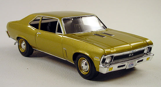 1969 Chevrolet Nova SS396 - (built 1997) Here's a my build up of AMT's '72 "old pro" Chevy Nova SS350 kit. Except, I converted it to a '69 Chey Nova SS396. The real car was a sleeper. To change the body back to a '69, I created the little vents on the front fenders with stryeen plastic strips. I added a big block motor from my model car kit parts box. Also I added a set of resin dog-dish style hub caps and steel wheels from another kit to help re-inforce it's sleeper image. The paint is a factory gold color.