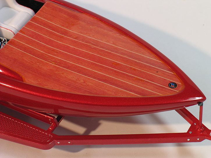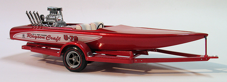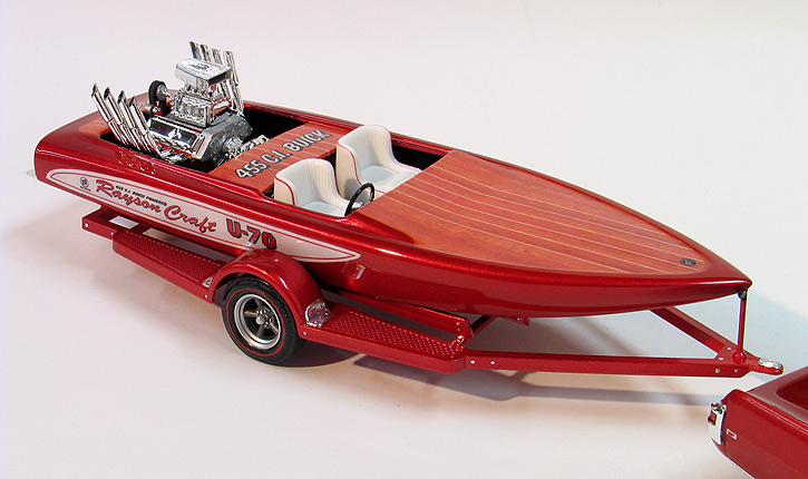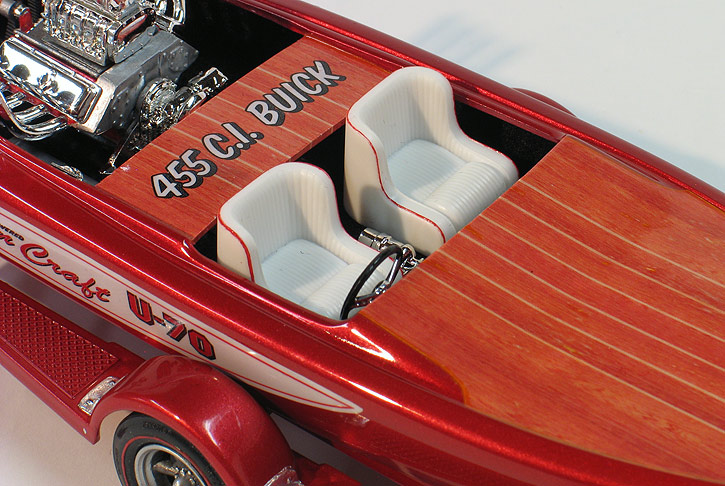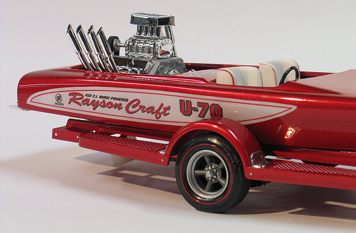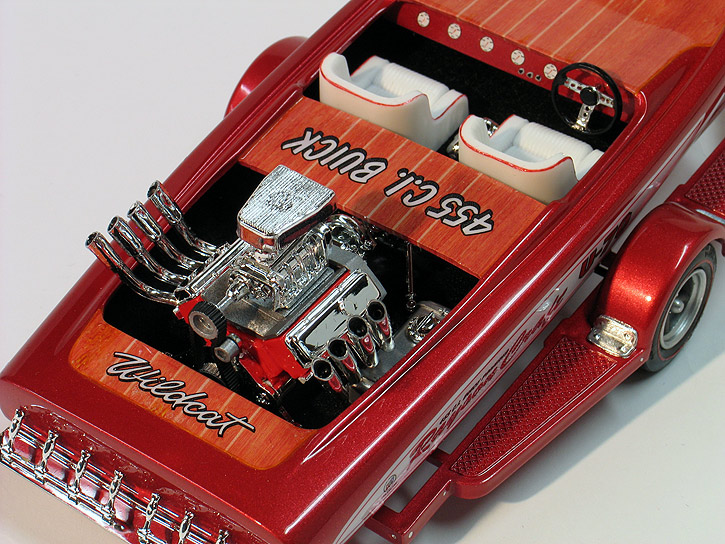 The Rayson Craft drag boat and trailer were pretty much built right out of the Pontiac's box. One small change though was adding a different set of valve covers to the engine to make it look a little more like a 455 ci Buick motor. For the boat I did want to do something a little special. It comes molded with a wood deck and after some thought I decided to make a set of custom decals for the wood decking rather than trying to paint it. This became one of the most time consuming challenges with the entire project.