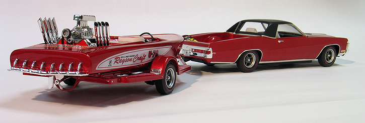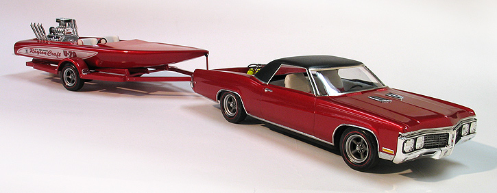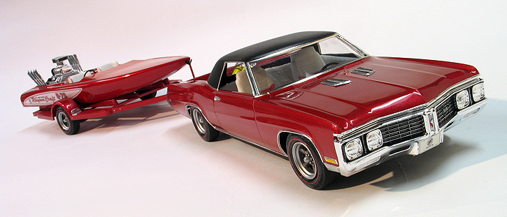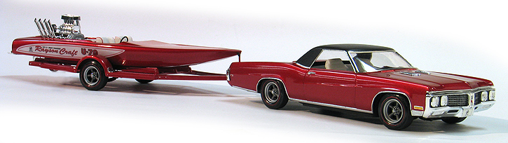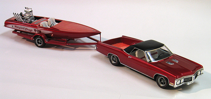 I wanted the car, trailer and boat to have a period correct 1970 look. For color I painted them with Tamiya metallic red. After the decals were applied everything was shot with a urethane clear and then finally the top of the Buick was sprayed with a textured semi-gloss black to represent a vinyl top. The wheels are the optional Torque Thrust wheels found in the ancient AMT '68 Shelby GT500 kit. Using these wheels necessitated buying a second Shelby kit so I could get a matching set of wheels for the trailer but I thought it was worth it. The plating was stripped of these wheels and they were painted with various shades of Testors Metalizers to make them appear more realistic. The tires came from two Buick kits. I painted the redlines by hand.