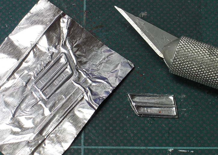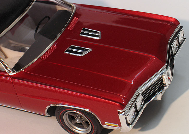 In my back story I imagined Buick borrowing another styling trick from the Chevy playbook and creating hood vents similar to those found on 60's Super Sport models. To keep the styling correct for a Buick though I moved the chrome vents from the bottom of the front fenders to the top of the hood. To accomplish this trick I made an impression of the vents using aluminum foil. Then I filled the back side cavity with 5 minute epoxy. After the epoxy hardened, I trimmed out the shapes and had myself a pair of chrome vents for the hood. I then carefully sanded off the molded-in vents from the fenders. While I was at it I also removed all the molded in emblems for a smoother custom look.