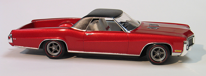 Sometimes for my models I like to create a back story to give them a context. For this project I imagined GM building an El-camino style Buick pickup show car for the 1970 auto show circuit. Back then auto makers often built custom cars based on production models to draw attention to a new model. Since the Bonneville kit came with a Rayson Craft speed boat and trailer I thought it would also be cool if my show car was pulling a matching Buick powered speed boat.