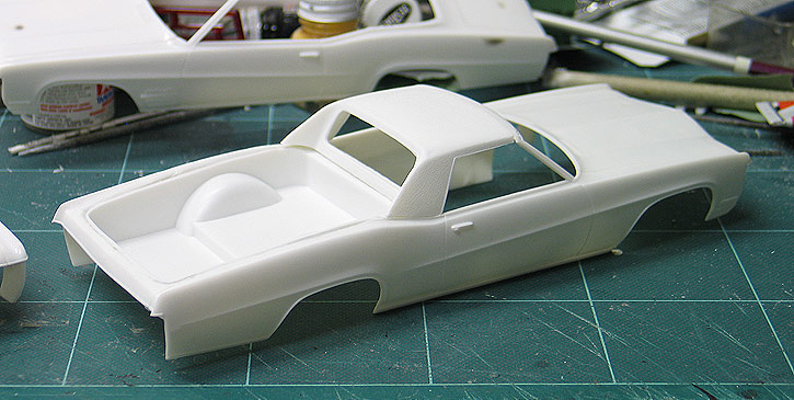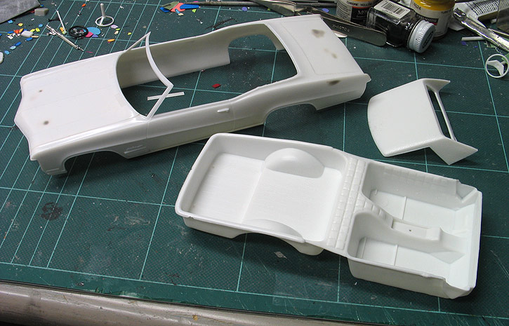 To create the pickup I first took some measurements of the Bonneville's pickup parts and then transferred them to the Wildcat. The Pontiac's interior and pickup bed is molded as one piece so I cut them apart just behind the seats.