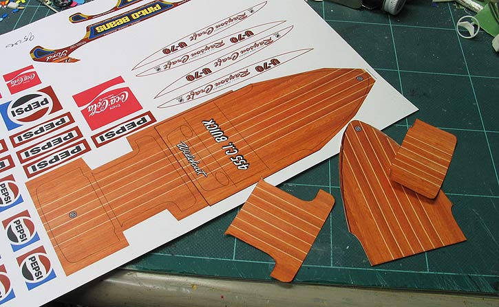 First, I created some paper templates from the model and then scanned them into my computer. Next, I did a Google image search for photos of wood patterns and turned up some nice high resolution pics of wood flooring samples. I drug these into Photoshop and manipulated them into the right scale, color and shape that I wanted. I also created a matching wood deck floor for the Buick's pick up bed. I created the side panel art for the boat at the same time. It's not a replica of any particular boat but it's in the spirit of other drag boats I've seen from that era. This whole process took quite a while as there was a lot of back and forth trying to get the shapes to fit right before printing a final set of decals. Finally, after I had a fit I was happy with I printed the decals on a high quality ink jet printer using white decal paper from Bare Metal Co. The decals were then coated with a couple coats of Tamiya clear to waterproof them before applying them to the model. I hadn't used this decal paper before and because the surface area of the decal was so big it was very delicate and tricky to work with. But with patience it ended up working fine.