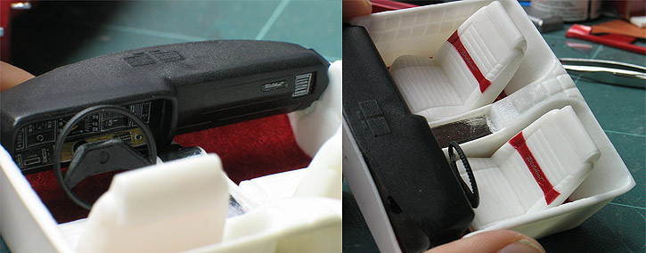 For the interior I used the custom 2 seat interior from the Pontiac and modified it to accept the dash and front buckets from the Buick. I kept the detailing pretty simple on the interior and just added Detail Master dark red flocking for the floor after painting.