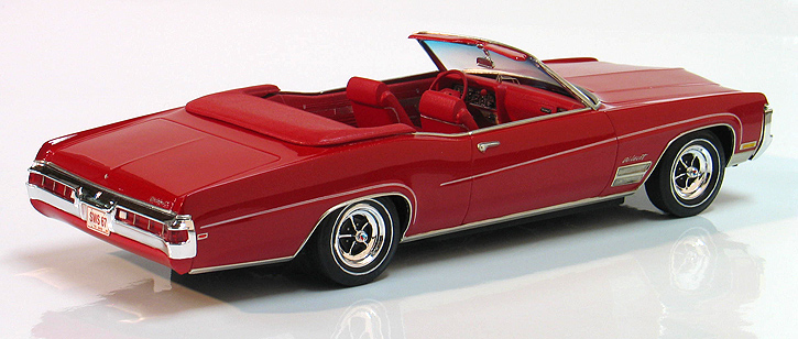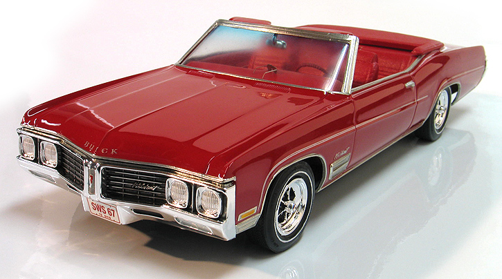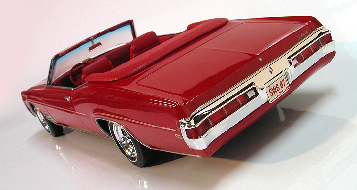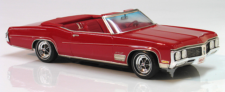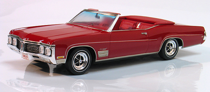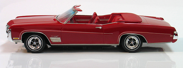 To convert my hardtop Wildcat into a convertible, I removed the top with a razor saw. I then robbed a Model King re-issue of the MPC '70 Pontiac Bonneville convertible kit for it's convertible boot and it sunvisors. The Pontiac's convertible boot fits the Buick pretty well and only needed an few small adjustments. I then modified the Buick's interior by adding boot wells that mate to the convertible boot. For paint I sprayed the body and interior with Testor's GM flame red lacquer which is a very close match for the 1970 factory Buick color called Fire Red. After applying the white pinstripes supplied in the kit, the body was then shot with PPG urethane gloss clear.