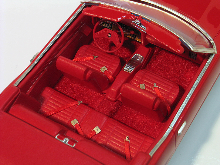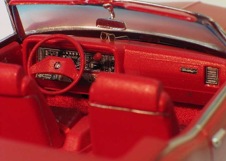 The interior parts were shot with various gloss and flat clear sprays shot at a distance to dust coat the parts and give them a leathery texture. Since the interior was going to be fully visible in this car also I spent a little extra time detailing it with carpet flocking and photo-etched seat belts & sun glasses. I also made a column mounted shifter for the automatic transmission from a needle. Other details include white walls painted with a ruling pen and blue tinting airbrushed on the windshield.