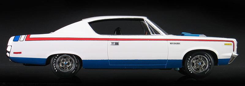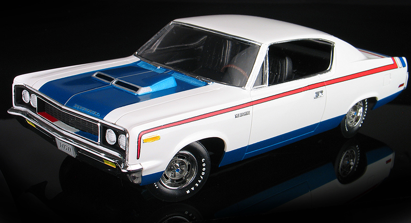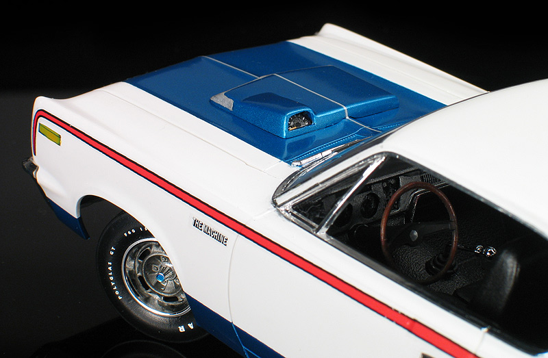 I built my example straight from the box with a couple of small exceptions. The decals in the Johan kit were pretty crude looking. Johan quality control was not always the greatest and my decal sheet was blotchy and the color weren't registered correctly. I decided to upgrade to a set of corrected Keith Marks decals. These are much nicer and also have all the little emblems on the sheet. One notible decal missing though was the thin silver center stripe down the hood. I combed through parts box and turned up a suitable silver stripe which I cut from the optional hood stripes from the decal sheet of an AMT '70 Z-28 kit. Also, I created my own artwork for the Goodyear Polyglass GT white letter tires and had a custom set of dry transfers made. Lastly, I swapped out the kit's crude looking original generic tires for a set of better looking ones from the AMT/Ertl '71 Charger kit. The paint is Tamiya bright white with their light metallic blue sprayed on the hood and rocker panels. It was a simple and fun-to-build kit and now I have another piece of iconic Johan AMC muscle in my collection.