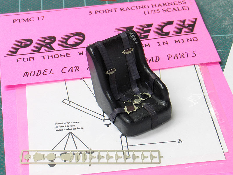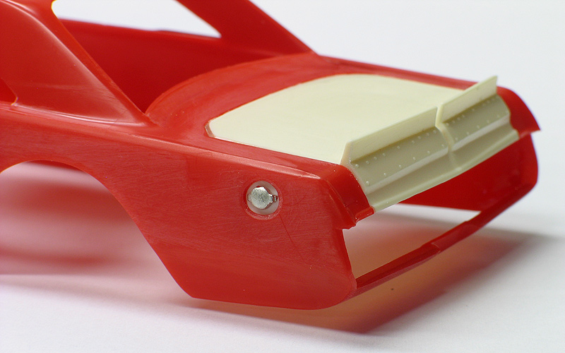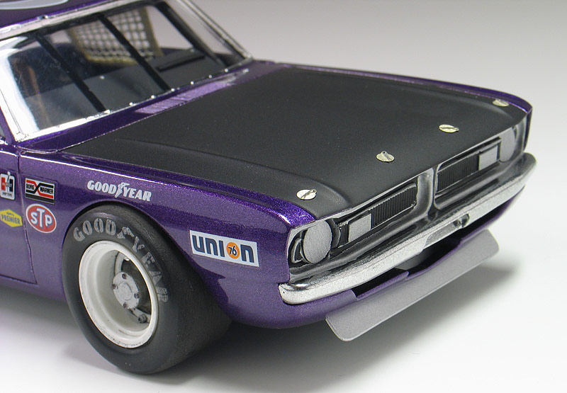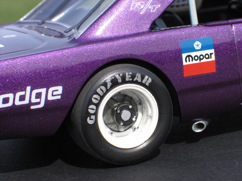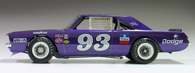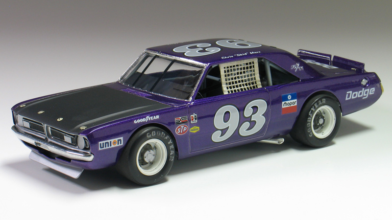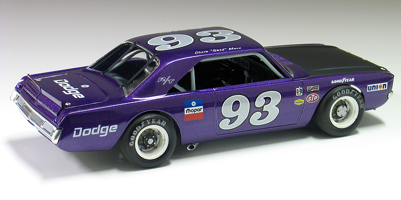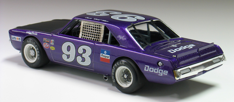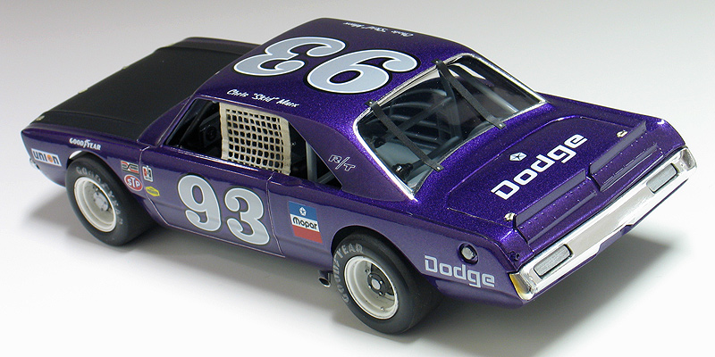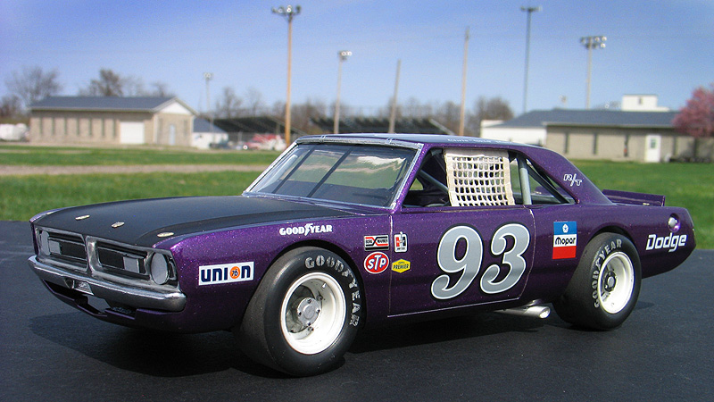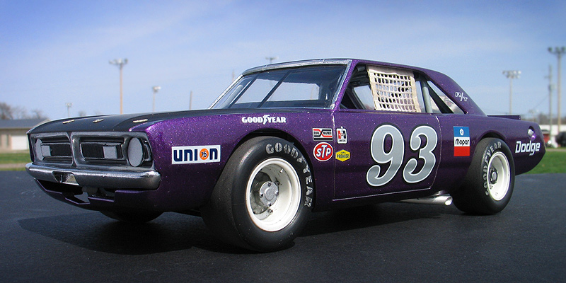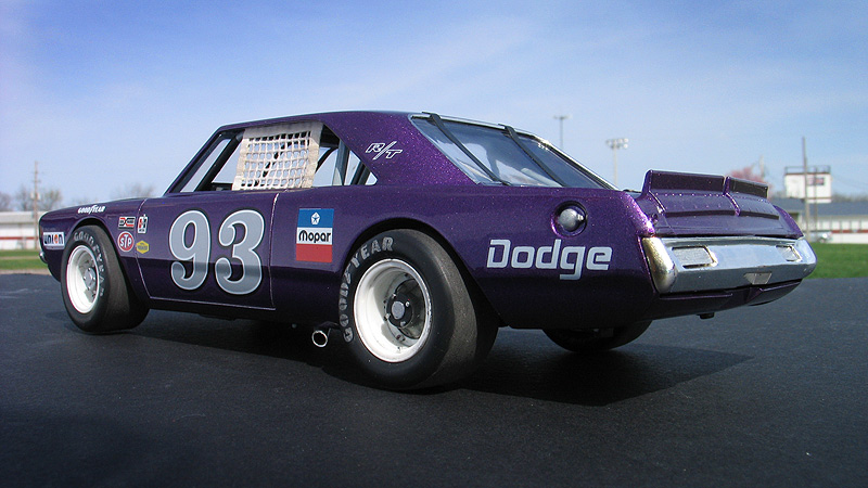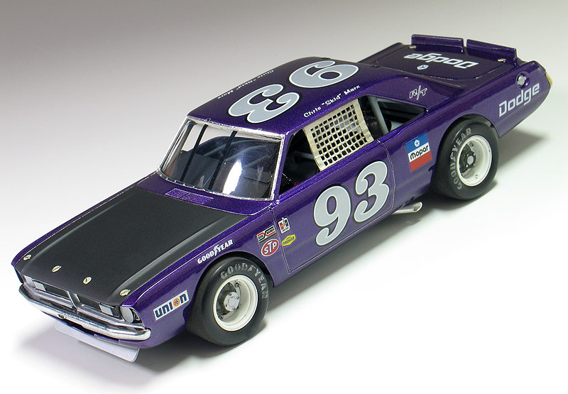 1970 Dodge Dart short track race car- (built 2013) Most small towns have a short track of some sort. Some are paved and some are dirt. Some are an eighth/mile in length. Most are much shorter. What they all have in common is they are a gathering point where communities go to see their local hometown heroes battle it out on a Saturday night. I had an extra MPC Dodge LA Dart wheel stander body and I one day was wondering what I could do with it. I briefly considering trying to convert the LA Dart body back to stock but this kit comes without stock trim, a trunk lid, front bumper and has large radiused rear wheel wells. After thinking about it a little while I decided I could turn this body into a neat '70's style fictional late model sportsman short track race car. I also happened to have a bunch of MPC generic '70's NASCAR chassis too. After a little test fitting, I discovered the chassis would fit nicely with a few simple modifications to the roll cage and wheel base. And with that... my hometown hero short track late model sportsman project was born. To convert the body into a short track car I enlarged all four wheel wells with a Dremel tool. Next I bought a resin re-pop of the old AMT Petty Dart trunk lid from a vendor on ebay. The resin AMT trunk only needed a little bit tweaking to fit the MPC body. The LA Dart front grill is very simplified and does not include a front bumper or turn signals, so I ordered a resin re-pop of the MPC '71 Dodge Demon front grill and bumper combo from Hart's Parts. The Demon grill is much more accurate looking and is correct for a Dart too. The resin grill / bumper also needed some minor tweaking to fit the Dart body. It was then painted with Alclad for a chrome look. I added head light and turn signal covers that I made from scratch. I wanted my Dodge to have an appropriate Mopar Muscle car color. Once all the body work was done, I painted the Dart body using Testor's Plum Crazy metallic purple lacquer. Since my car was fictional, I used decals from various Model King stock car kits I've designed decal sheets for. Then the body was clear coated with PPG urethane clear. Lastly, I painted the hood flat back and the interior / chassis gloss gray. The wheels are resin pieces from ebay mated to a AMT Goodyear slicks. The Goodyear lettering are decals which I then dry-brushed with a little flat black to make them appear more realistic. I also added a scratch-built front spoiler, a window net, a fuel filler overflow tube, exhaust pipes made from aluminum tubing and window straps. Normally, I just shoot studio style photography where I can control the lighting more easily. For this particular model I wanted to experiment with natural light in a realistic setting. I shot the outdoor shots in front of the Columbus Motor Speedway, which is my local short track, so I could get some of the grandstands and light poles in the background. Just for fun, I also shot the Dart on an old AMT service trailer with a purple Dodge Van that I built for another project. I think they look pretty good together. When the car is shot from a low angle it looks convincingly real. Other mods include Pro-Tech (PTMC 6) photo-etch hood pins , a Pro-Tech (PTMC 17) photo-etched 5-point harness, a Pro-Tech (PTMC 60) cast metal gas cap, and Pro-Tech (PTMC 72) machined aluminum valve stems. These are really nice parts and very easy to work with. Click here to check out Pro-Tech's web site.