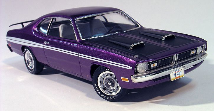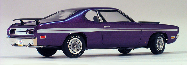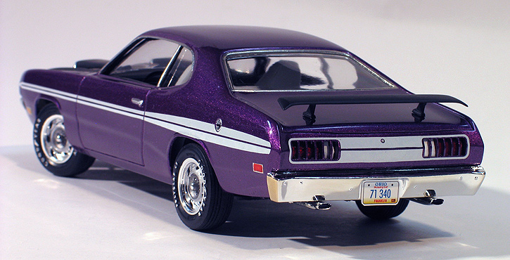 Although initially I thought using the Duster chassis would be a simple swap, especially since I was just building a curbside model, it turned out to be a little more challenging. I ending up have to do a lot of grinding and trimming on just about everything in order fit the chassis, interior, clear parts and body to come together right. I think it was worth it though as the Duster chassis looks much nicer and has the option of pose able steering. Final details included adding the optional factory rear wing which also came from Duster kit and my own custom made license plates.