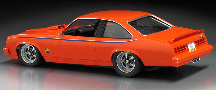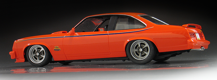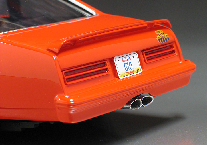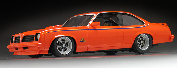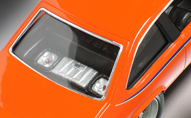 I wanted to replicate the '69 Judge paint scheme so I sprayed the body with Testor's "Hugger Orange" lacquer paint. That's a Chevy color but it is a close match for a '69 Pontiac color called "Carousel Red." The Judge decals came from the Model King re-issue of the '69 GTO funny car kit. The side stripe decals if used as is would not have been long enough to fit the contours of the Ventura, so I used a second set of decals from a second kit to cut and splice together a longer stripe for each side.