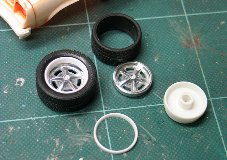 I wanted my Ventura to have a set of old style muscle car wheels, but in a modern size. To make the large diameter Pontiac Rally II wheels I started with a set of wheels from the Revell '69 Judge kit. The Revell wheels are in 1/24th scale and measure out to about 17" in 1/25th scale. This was a start but I wanted them bigger and wider, so I cut the rims off the 18" wheel backs from an AMT 2009 Challenger kit in two different widths. These were then mated to the front of the Revell wheels to end up with a one off set of wide and wider 18" Rally IIs. The big rear tires came from a Revell C5 Corvette kit and the smaller front tires came from a Fujimi optional wheel and tire kit.