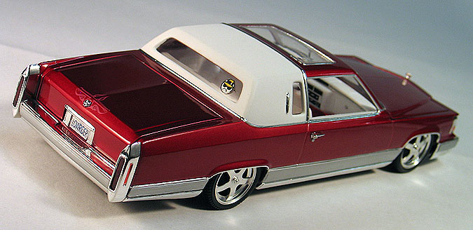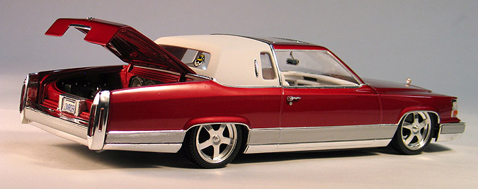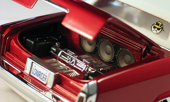 One of the neat features of this kit is it's opening trunk which shows off a stereo system and hydraulic pumps. I painted the carpeting in the trunk and interior dark red and added flocking material for a more realistic look. I also added a pair of my own resin cast amplifiers to complete the stereo.