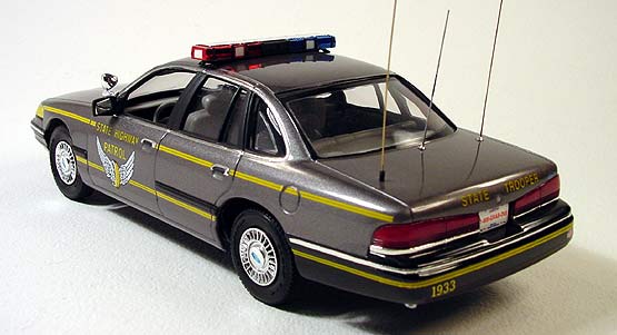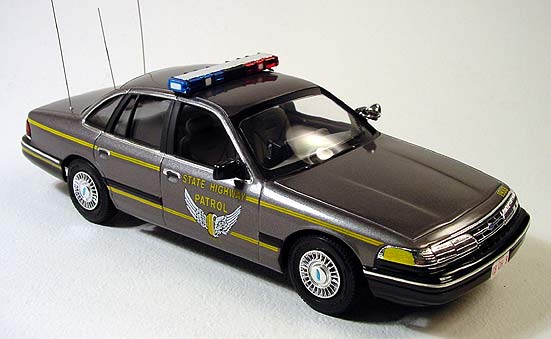 1996 Ford Crown Vic Ohio State Highway Patrol car - (built 1998) I built this replica of a 1996 Ford Crown Vic Ohio State Highway Patrol car - form the Linderb kit first issued in the late '90's. To make it more accurate I removed the door trim, added a light bar from the Ertl Ghostbuster's Ecto-1 kit and antennas made from guitar string.