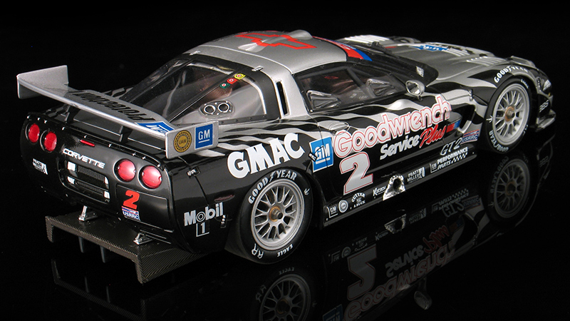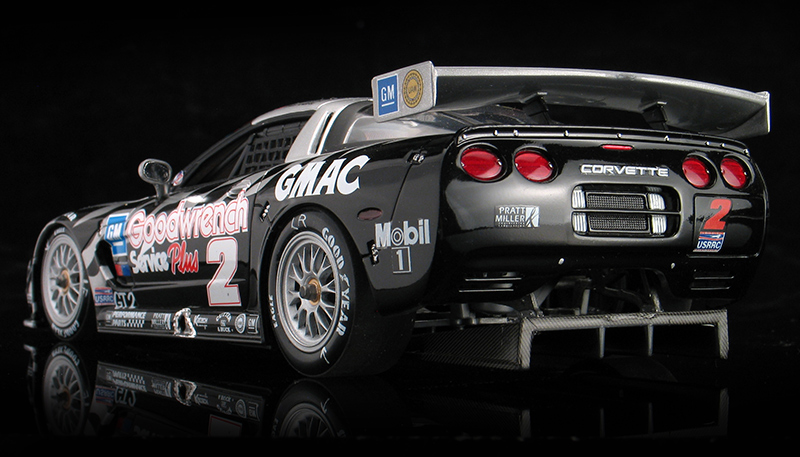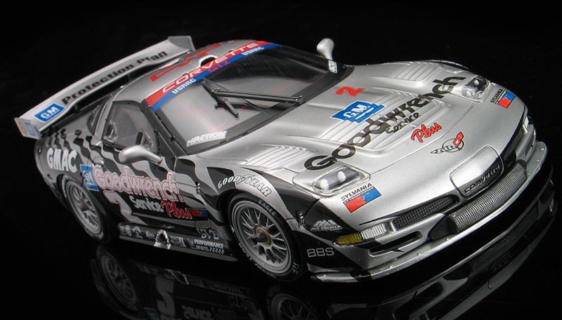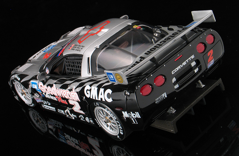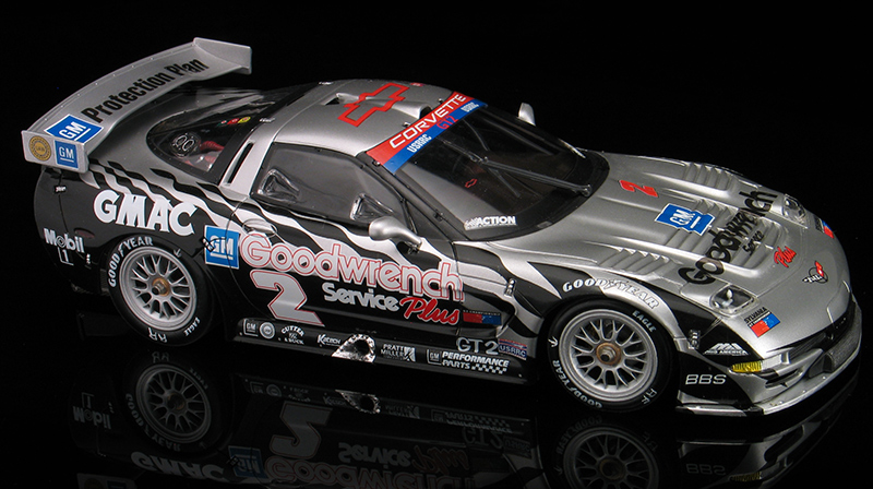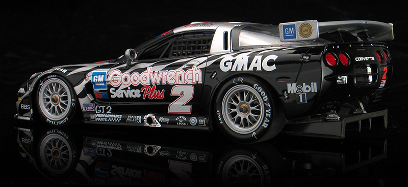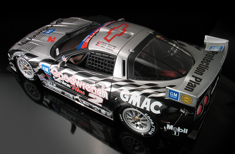 2000 Goodwrench Chevy Corvette C5-R - (built 2001) The Chevy Corvette has a long history of road racing. Starting in the 1950's, it has been a favorite on the track and Corvettes have graced the winners circle. One of my favorites was the Goodwrench sponsored C5-R that was raced in the Rolex endurance series. The car featured a unique silver and black checkered flag paint job that I really liked. I was really excited when I first heard that this car was coming out as a 1/25th scale model kit and I bought one as soon as I first saw it. It's a replica of the car Ron Fellows drove in the 24 hrs of Daytona. This kit is the pre-painted version that was the first issue of several C5-R kits made by Revell. Although this kit comes with it's body pre-painted that doesn't mean it was necessarly a simplistic kit to build. Infact, it's a nicely detailed replica. I built mine pretty much straight "out of the box." I did add for some aftermarket carbon fiber decals to the interior and rear aero diffuser to help the model look more realistic. The kit goes together really nice. My only complaint would be that the suspension needed some modification in order to get the nose down at the proper level. I also had to thin the wheel wells down with a dremel tool to produce a proper "scale" thickness. I thought the wheels sat a little to far inboard "out of the box" so I modified them to sit out closer to the edge each of fender lip, too.