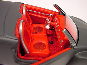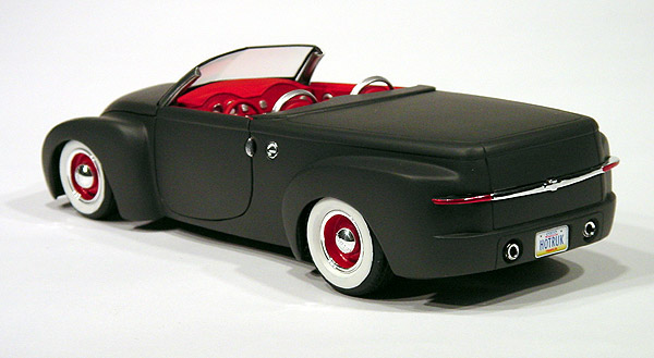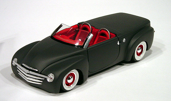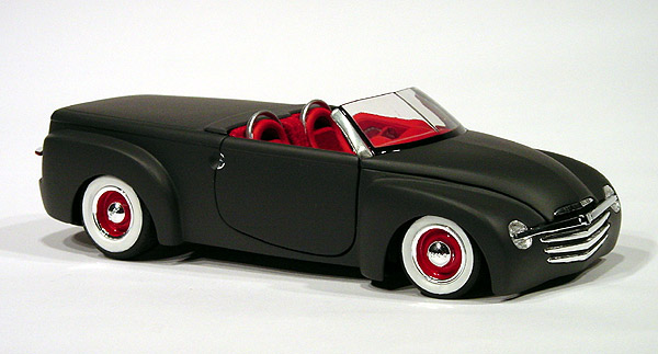 I built this 2003 Chevy SSR "rat rod" pickup by using a Maisto 1/25 scale diecast replica. Originally, I bought the replica just so I could use the wheels and tires on my custom Buick Rendezvous. After I disassembled the replica, I got to thinking that this would make a pretty cool looking "rat rod" style street rod. So, I stripped off it's original blue paint and started rebuilding. First, I decided that it would look better with it's top down. Using a band saw, (this is a metal model after all) I cut off the roof and ground down the rough edges with a grinder. To finish off the chop job I added a scratch-built tonneau cover behind the seats and trimmed the height of the windshield and it's posts down about an 1/8". Next, I buffed the windshield posts to a polished finish and decided to leave them unpainted. Other bodywork includes filling in the recessed driving lights up front and the round taillights out back for a smooth custom look. For taillights, I just painted the ends of the chrome strip across the tailgate to make them look like a blade style. Then the body was painted with a custom mixed shade of dark primer gray. The interior was detailed with red flocking to simulate carpeting. The fifties style seat pattern was made using decals from Scale Motorsports. And, lastly I made an old style tall shifter from needle globbed with 5 minute epoxy at both ends to represent the ball and boot. Lastly, I reassembled the model, dropped it in the weeds, and put on a set of big and little meats. The wheels and tires coming from a Monogram Beach Boys 32 Ford kit. The wheels were detailed with hand painted white wall tires and red steel wheels. The hub caps came from a AMT '53 Chevy pickup kit.