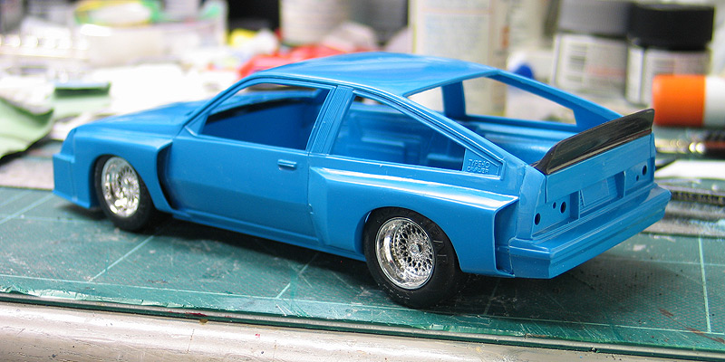 Below you can see the body before I added the pontoon style flared fenders. First, I removed the body side door moldings. Then I added the basic five piece body kit included in the MPC kit but did make a couple of modifications. I didn't like the boxy notch shape in the front fenders next to the headlights, so filled in this transistion with putty and blended it to the front facia for a more aerodynamic look. I also ground open the back end of the flares with a dremel tool to allow air flow to escape, which is more common for race cars using this type of body work. The front wheel openings was also slightly radiused for more wheel clearance. Lastly, I also added a rear spoiler made from a cut-down 1/20th scale Monogram Camaro rear spoiler.