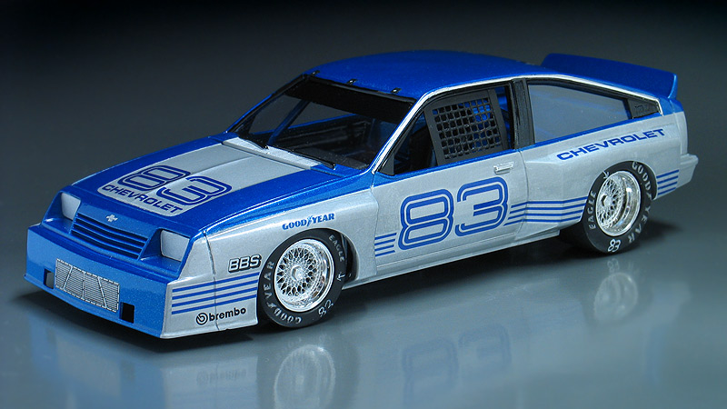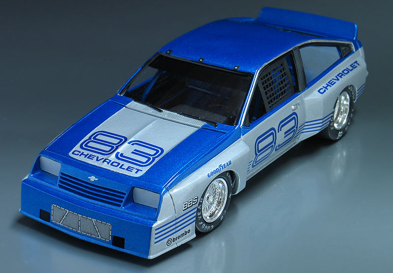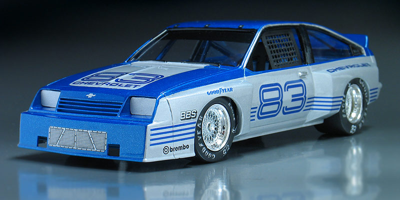 Since this was a fantasy build, I designed a fictional factory paint scheme for my Chevrolet using thin "laser" stripes that were all the rage back in the '80's. I made my own decals and printed them on clear inkjet decal paper. A benefit to using clear decal paper is that when you use clear decals over a silver base the transulcent inks appear metallic once applied to the car. The other small sponsor decals were taken from various left over sheets from my parts box. I also incorporated a grill decal from a Slixx NASCAR goodies sheet to help visually break up the space on the big front air dam. I also made headlight covers from sheet styrene to replace the stock headlights. Lastly, I notched the passenger side rocker panel for an exhaust outlet and made a set of dual exhaust pipes from aluminum tube. After final assembly, the exhaust was drybrushed weathered to look more realistic. The rest of model was built "curbside" style so I doesn't have feature any engine or chassis detail.