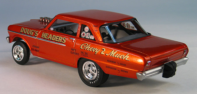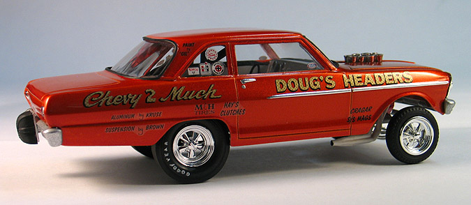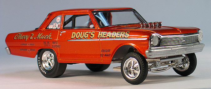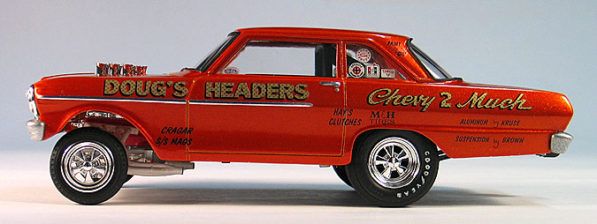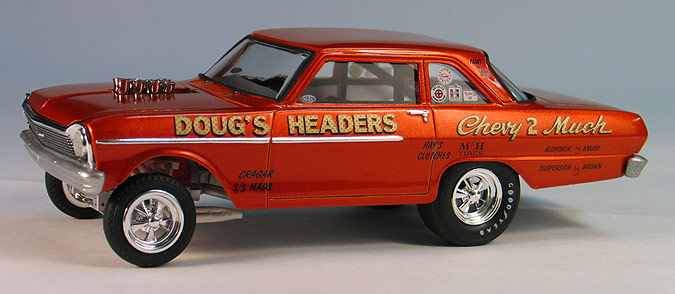I have always been a big fan of the wild altered wheel base drag cars from the 60's. A decade ago building a replica of one of these cars would have involved using rare kits and a lot of scratch-building. With the recent Model King re-issues of AMT's AWB kits and the aftermarket it makes building these cars a lot simpler. One of my favorite drag cars of that era was the Doug's Headers "Chevy 2 Much" that was campaigned by Doug Thorley. I built my replica by starting with a Model King re-issued AMT '65 Chevy II "Rat Packer" kit. The kit comes with a hardtop body, but the Doug's Headers car was based on a sedan body. The difference being in that the sedan has a taller roof, post windows, and a different contour to the rear window. To solve this problem I took the easy way out and just used a Model King resin body available from Hobby Heaven.