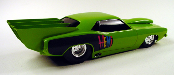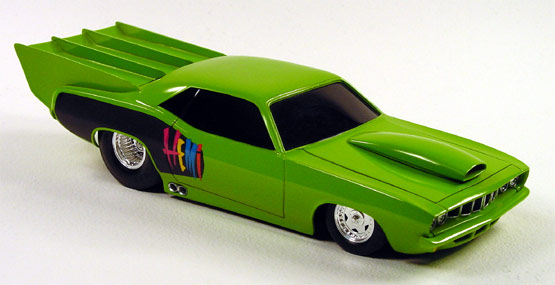 1971 Plymouth 'Cuda pro mod drag car - (built 1996) Here's a neat slam model I built back when Pro Mod Drag cars were just starting to get popular. I started with a Johan Sox and Martin '71 Plymouth 'Cuda kit and added a scratch built wing and rocker panel skirts. The hood scoop was modified from the Revell Matt and Debbie Hey T-bird pro streeter. The wheels came from the parts box and I hand painted the HEMI graphics .