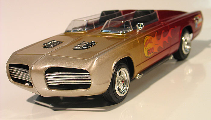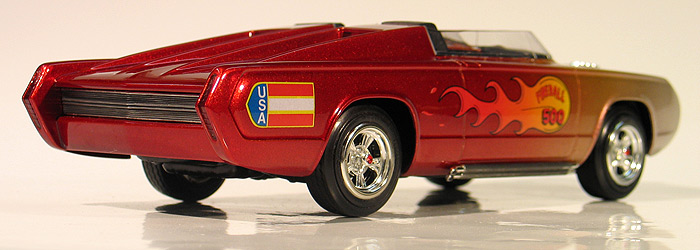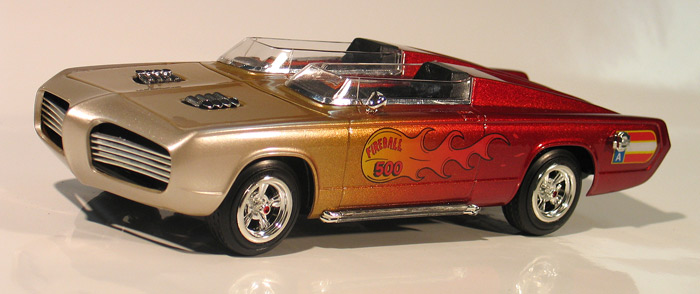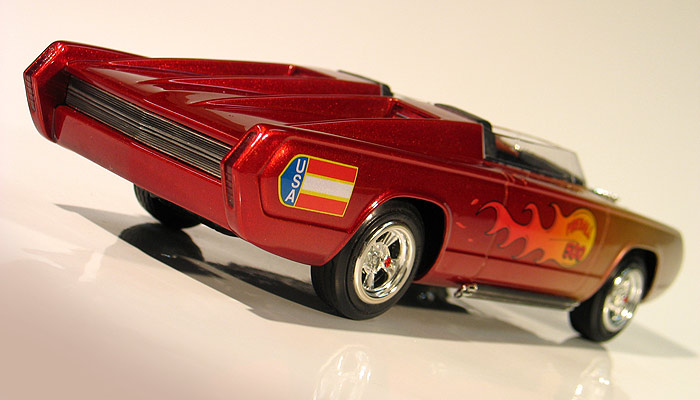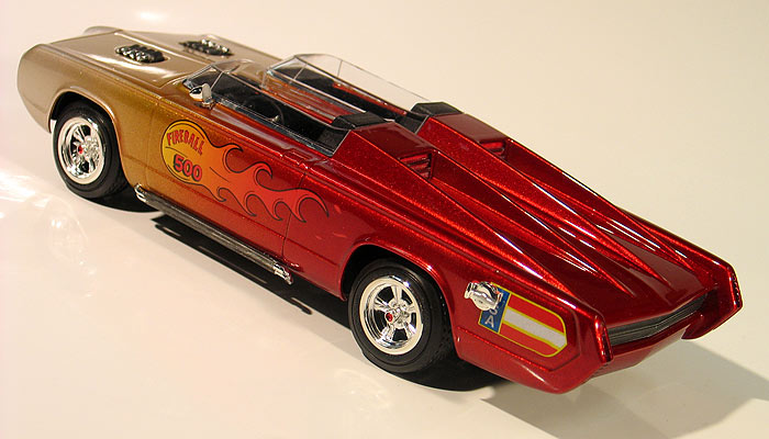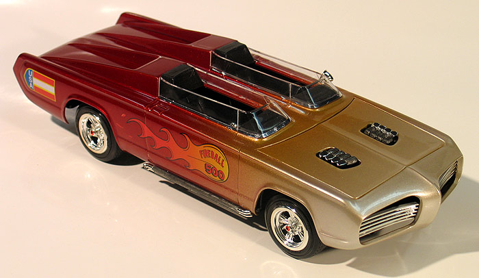 George Barris Fireball 500 - (built 2006) Back in the ‘70s my parents and I took a trip to Hollywood and I got a book about this guy named George Barris. It was called “Cars of the Stars” and detailed his extensive career making cars for the movies like the original Batmobile. I was really taken with the cars in the book even though all those movies and TV shows appeared before I was born. The book was pretty influential on me because he was the first guy I ever heard of who made a career out of customizing cars and I still have the book today. In it is a picture of George’s office and on his book shelf are all of the kits AMT made of his cars. I always thought it would be neat to try and track down some of those kits and build them. Over the past few years RC2 has re-issued a few of these old AMT kits and most haven’t been available for 30 years. One that caught my attention when it was reissued was the old Fireball 500 kit so I bought one and decided to build it. The history of the real car is kind of interesting. It was based on a then new ‘66 Plymouth Barracuda and built for the B movie race car flick “Fireball 500” starring Frankie Avalon. Although the book I have does show pictures of the car they were all in black and white. A quick search on the web turned up two paint schemes of this car. The first version which matched the pictures I had in my book showed the car with a paint scheme that faded from candy red at the back to gold in the middle of the car to pearl white at the front. My pictures show this version on a sound stage with Frankie at the wheel so I am presuming that this is the film version. The second version I found shows the car painted candy red and fading to solid white across the front without the gold. There are also some other detail changes to the windscreens and slighty different graphics were added. I am guessing that at some point the car was repainted and put on show tour duty as most of Barris’ cars were done with in the ‘70s. The decals that come in the kit represent the later show car version but after comparing the photographs I decided I liked the earlier film version better, so my model ended up being a combination of the two. For paint I airbrushed a base coat of Duplicolor primer followed by a base coat House of Kolor Pagan Gold. Next I airbrushed 4 coats of HOK Candy Apple Red over the back half of the body and then airbrushed 4 coats of pearl white over the front half. After applying the decals, a final coat PPG Concept2000 urethane clear finished off the paint job. I wanted to keep this build pretty simple the rest of the kit was built straight out of the box. I find these old AMT kits really fun, easy to build and they bring back a lot of childhood memories.