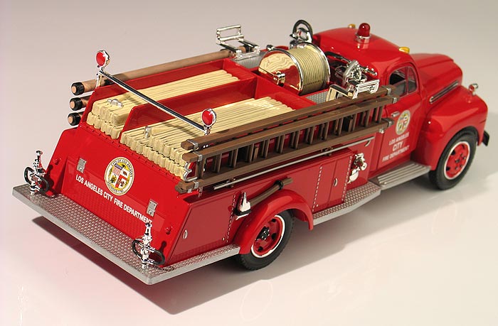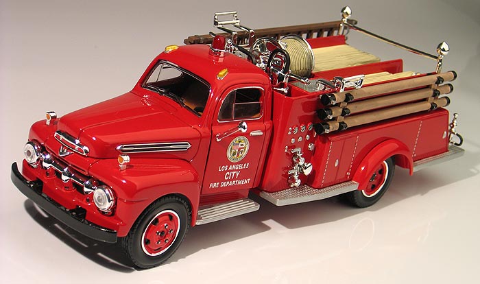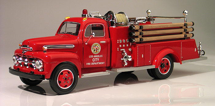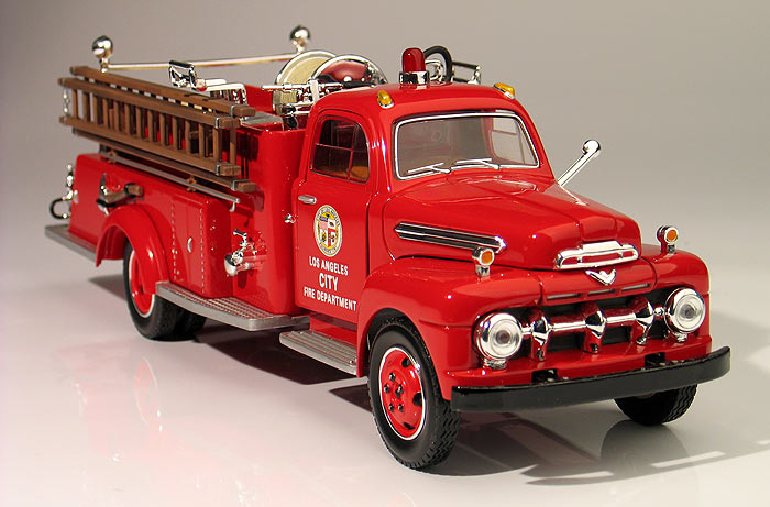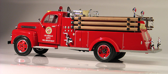 1952 Ford Fire Truck - (built 2005) I was looking for a quick project to build and I came across this IMEX 1/25 scale 1952 Ford Fire truck kit at my local hobby store. It was a simple pre-painted die-cast kit but I thought with a little detail painting I could have myself a nice self model in just a few evenings. I basically built it out of the box, but I added some detail painting to the wheels, running boards, trim, and grill as well as adding some thinned flat black washes over the hoses and other equipment in the back to add a little scale realism. The front bumper comes from the kit painted silver but I thought it made the truck seem too fancy for such a hard working vehicle. I painted mine black instead. It was a pretty simple kit but with a little detail I think it really comes to life.