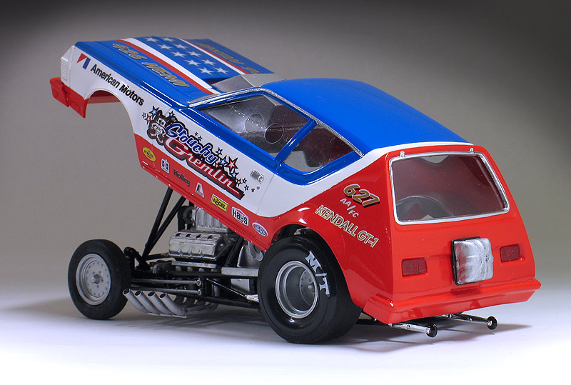 The model kit manufacturer AMT made a series of fictional short wheel based funny cars model kits during the '70's. The kits all shared the same chassis but had different bodies. The bodies included a Gremlin, a Pinto and a Vega Wagon. I don't think any drag racing teams actually ran these short wheel-based machines, but I still think they look pretty cool. Recently, I purchased a version of all three kits from various sources. I built the Pinto a couple of years ago and I just recently finished this 1975 American Motors Gremlin funny car. The Vega funny car still awaits its turn on my work bench.