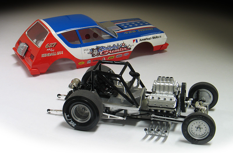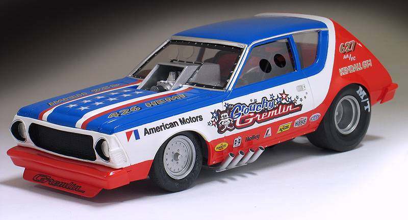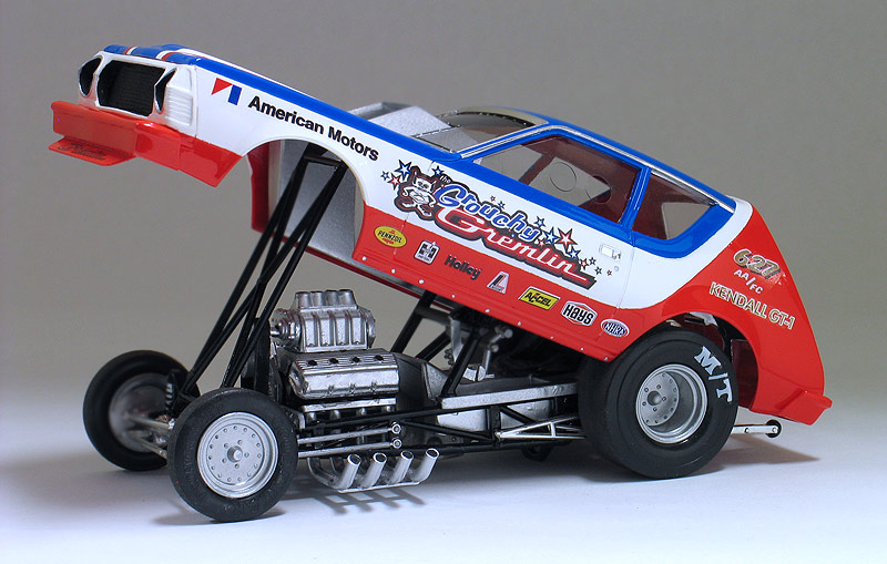 This particular 1975 AMC Gremlin funny car came to me as a previously built up model that was built many years ago by my friend Dale when he was a kid. (Shown below) I carefully disassembled the Gremlin and soaked all the parts in Castrol Super Clean to remove the old paint. The body was then cleaned up and some of the trim removed to make it look more like a one piece fiberglass funny car body. This included fixing the bumpers to the body and removing the bumper guards. I made the front spoiler from sheet styrene. Lastly, I also enlarged the rear wheel wells because I wanted to use a larger drag slick.