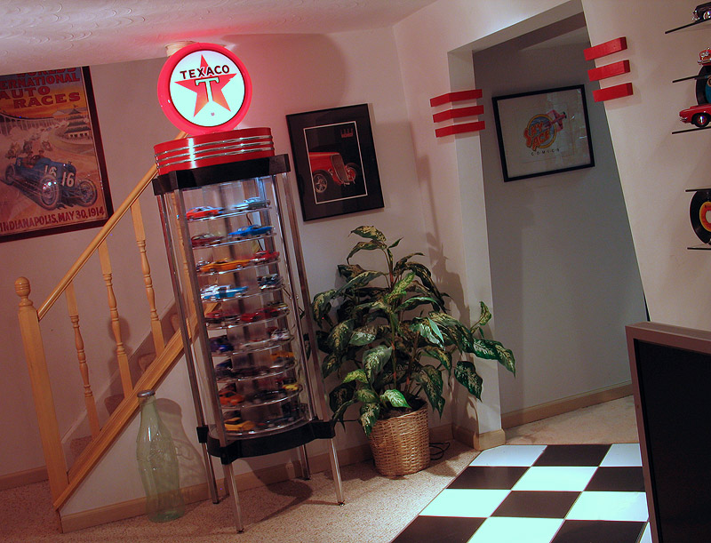 Texaco Model Car Display Case - (built 2014) I built this custom Texaco Oil themed model car display case by re-purposing an old Timex Watch display that I found on Craigslist. I have several other wall mounted display cases in my man cave but I was wanting a freestanding unit. I was looking for something unusual that could be a centerpiece in my room. I searched our local Craigslist ads hoping to find something different than the standard glass counter displays that most people use. Finally, after several months, this old cylindrical Timex Watch display popped up for $50. Luckily, the address for the listing was only 4 miles from my house. So, I hopped right over and bought it. Timex made these displays in various styles from the '50's through to the '80's to display wrist watches. I believe mine dates back to the '70's but I'm not really sure as there were not dates to be found anywhere on the display. A really neat feature of these displays were the fluorescent lighting mounted up inside the topper and the rotating shelves that were driven by an electric motor. Thankfully, both of these still worked in my display. While the display was in generally good condition it did have a few issues. First, the Plexiglas outer tube was scratched and had yellowed from sunlight. Also the silver edge molding on the shelves was falling off and the metal legs had some surface rust on them. After carefully disassembling the display I replaced the Plexiglas with an all new clear piece. The shelves and legs were carefully cleaned up and repaired. While I was at it I also repainted the metal access door. Since I wanted to use my display for model cars and not watches I decided to modify the topper so it would blend in with the other '50's automotive station gas design theme in to my basement. I bought a reproduction Texaco gas pump globe and made a light for it from some parts I got at Home Depot. I repainted the Timex top in red to match the Texaco globe and then mounted the globe on top. My basement has a 3 stripe motif running through the room, so I bought self adhesive 3M chrome 1/2" edge trim (found at the local auto parts store) and used it to add the three chrome stripes under the globe. I also replaced all the shelf edge molding using smaller 3M 1/4" chrome edge trim. This stuff is normally used to dress up door edges on cars and the chrome really added a lot of visual pop to my display. I also painted the bottom silver in silver to better reflect light from the bottom. I was really happy with how this display turned out and it stores about 45 1/25th scale cars. The picture below shows what the former Timex display looked like before I rebuilt it.