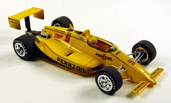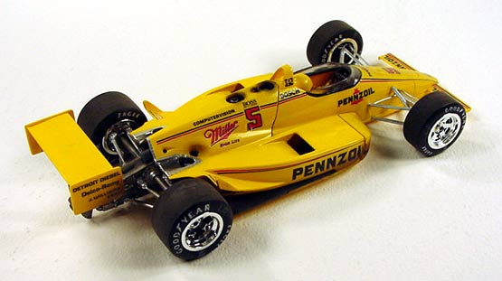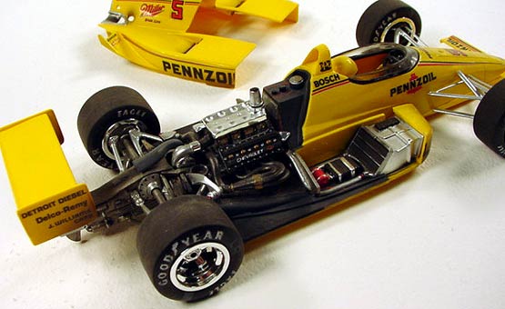 Pennzoil Penske PC-17 Indy 500 winner - (built 1993) I built this AMT Penske PC-17 Indy car to compete in the "out-of the-box" classes at various model contests. This was a very competitive model and won numerous awards back in the early '90s. For the class you can't use anything extra than what comes in the model kit box to detail them, so I had to relay on what I could do with paint. I airbrushed several different washes over the engine and bodywork to simulate normal race grunge.