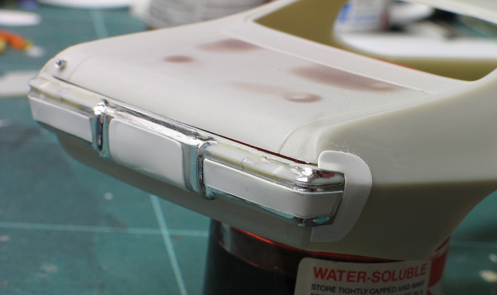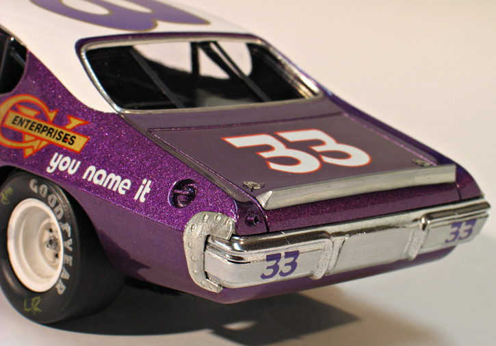 The rear bumper in the kit was about 1/8" too wide for the body. I narrowed it, cutting it into three pieces and taking out a 1/16th inch section between each tail light. After everything was glued back together, I made tail light and licence plate covers using sheet styrene. After some cleanup work, the finished bumper was painted with Alclad paint to restore the chrome finish. Styrene was also used to create the sheet metal fairings around the rear bumper. I also created the fuel filler and overflow tube from scratch. The rear spoiler was sourced from the MK re-issue of the '71 Cyclone stock car and cut down to fit the GTO's trunk. The front spoiler was built from scratch. The outermost headlights were ground out and replaced with a cover and the inner most headlights were painted to look like screened over ducts. The recessed grill was also modified so it would sit forward in the grill surround for a flusher fit and the hood scoop holes were covered with styrene.