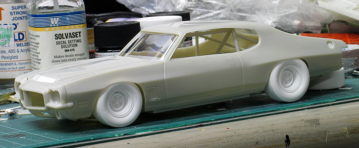 Using photos obtained on the web as a reference I first modified the body by opening up all four wheel wells with a Dremel tool and the front ones were reshaped with Bondo. I also Dremeled the back side of the wheel openings so they would have a more realistic scale thickness. The door handles & emblems were removed and the fender vents and turn signals were Bondo'd over too.