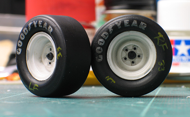 For wheels and tires I found a correct steel racing wheel in the Johan '72 Torino stock car kit and mated it to a Revell stock car tire. I then made a RTV rubber mold of the combo and cast a complete set in resin. I have plans to build several vintage stock cars using these wheels so it was worth my time to go through the casting process. The tires were painted and later detailed using the Goodyear lettering I created for the '75 Laguna kit decals. Afterward the tires were dry brushed with some flat black paint and various pastels to add a little weathering to them.