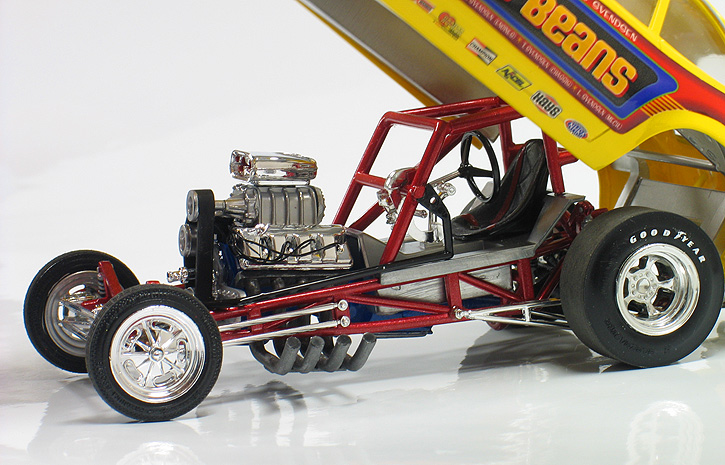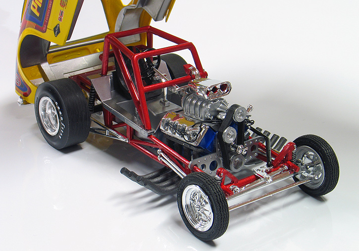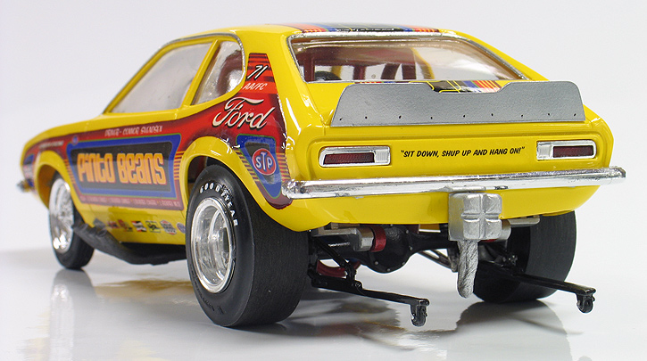 I replaced the missing engine with a blown Boss 429 motor taken from a MPC Multi-Maverick kit. I really hate doing engine wiring, but made a humble attempt at adding some ignition wiring. The Halibrand front wheels and tires came from the same Multi-Maverick kit as well. The rear wheels came from a MPC '74 Dodge van kit and the slicks came from my parts box. The rest of the chassis was built pretty much right out of the box from the Pinto kit. The final detail included using a parachute from my parts box and adding the chute lines.