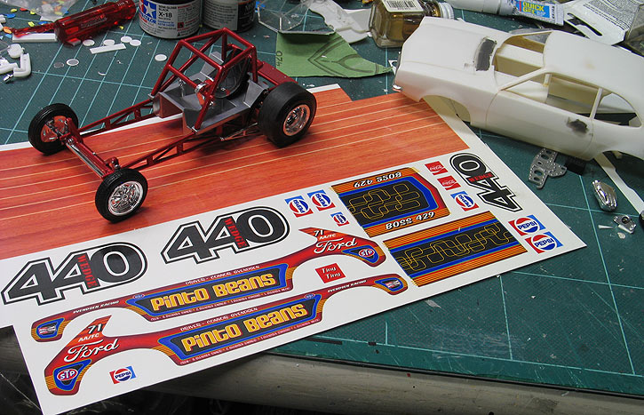 The really fun part of building this kit for me was creating my own decals. Since this wasn't going to be a replica of a real car I wanted to design some panel style '70's era graphics for my model. First, I made paper templates of the panel shapes that I wanted. Next, the templates were scanned into my computer. I then came up with the name "Pinto Beans" and created all the artwork on my Mac using Illustrator CS3 software. Next, the art was printed on white inkjet decal paper from the BareMetal foil company. After the ink dried it was sprayed with a two part urethane clear to waterproof the art and complete the decal process. For the paint job I sprayed the body with Tamiya bright yellow and the chassis was sprayed with Tamiya metallic red. After applying my custom made decals, the body was sprayed with another coat of urethane clear. The metal interior tub was painted with Testor's stainless steel and buffed to a high sheen. The front windshield included in the Pinto kit has a huge cut out for a big clear scoop which surrounds the blower. I thought whole setup looked too cartoonish, so I used the stock windshield and cut out a new smaller opening. I then added a new aluminum trim piece around the opening.