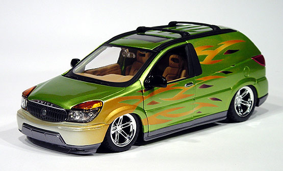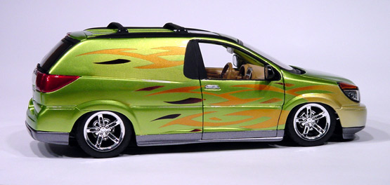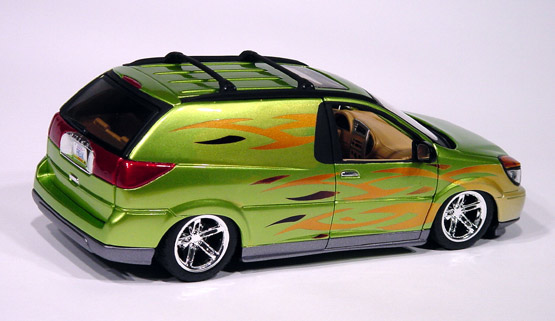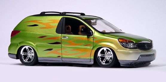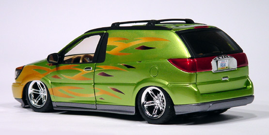 2001 Buick Rendezvous - (built 2002) Scrounging through the toy stores always turns up interesting modeling subjects. At a Toys-R-Us I stumbled across this 1/24 scale Maisto Buick Rendezvous die-cast replica. My first thought was, "what a waist of tooling dollars." Of all the cars that could have been made into a model, why pick this one? I happen to think the real 2001 Buick Rendezvous is pretty ugly. (Sorry, to offend anyone who owns one.) My second thought was, "hey, this is actually a nicely done model and maybe it would have some potential as a project." I tend to believe that with the right amount of customizing any car can be made into something cool. So I went ahead and bought it. It sat around for a couple of months on my work bench and then day it hit me that it would make a cool panel van. After carefully disassembling the replica, I soaked the body in lacquer thinner for a day to strip the paint. One nice thing about working with die-cast models is that it is very easy to strip the paint. After soaking in the thinner, the paint just slides off the die-cast body. Don't try this technique with a plastic model! Next, the back windows were glued into place and auto body filler was used to smooth over the windows and rear door lines to convert the body into a panel van. Also, I thought the front end looked kind of busy, so I filled in the recessed fog lights that had been in the front bumper for a smoother look. After the body work was finished I laid on the new custom paint. I was original thinking this would make some kind of cool surf wagon so I decided to go with a tropical theme for the paint. For the colors, I custom mixed a candy lime metallic green and applied it over a white base coat. It looks a little washed out in these photos, it's actually brighter in real life. Using an airbrush I applied the tribal-style flames which fade from a pearl white at the front to various shades of candy orange and raspberry. Afterward, the whole car was shot with PPG Concept 2000 urethane clear. The interior was repainted with my own custom mix of tan. Finally, I reassembled the model with a slammed suspension and added the wheels and tires from a Maisto Chevy SSR replica.