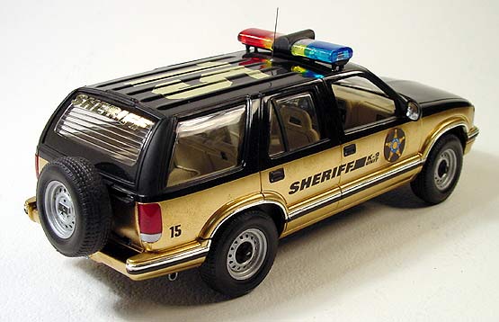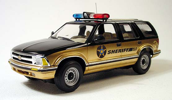 1995 Chevy Blazer Sheriff's Vehicle - (built 1996) Here's another in my series of SUV police vehicle replicas. Built back in 1996, I used Ertl's snap kit '95 Chevy Blazer and added various police car parts from the parts box. I also swapped the grill for the base model style found in the Ertl S-10 pickup kits and made my own resin wheels from a mold taken from the spare tire molded into the chassis. The spare tire carrier is also scratch built. The graphics are custom dry transfers which I designed on the computer. This model was featured in Terry Jesse's "light commercial" column in Scale Auto Enthusiast magazine.
