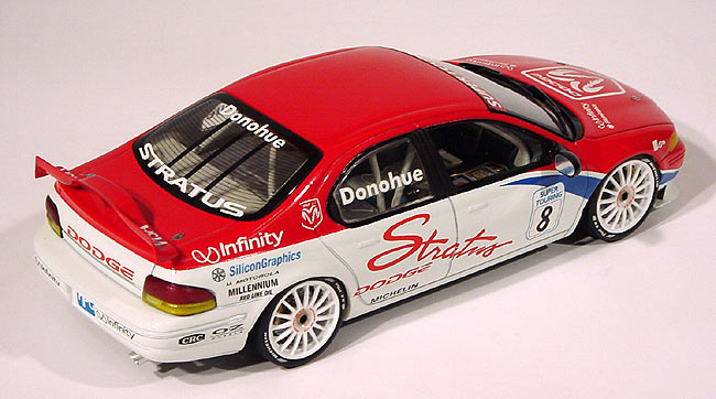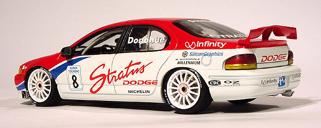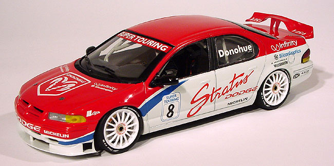 1997 Dodge Stratus NATCC touring car - (built 1999) Here's a replica I built of Dodge's factory sponsored '97 Stratus that ran in the short-lived North American Touring Car Series. My model was built by kit bashing a Brookfield Collector's Guide Stratus promo with a Tamiya Alfa Romeo German Touring car kit. After the promo was disassembled I stripped the paint using Easy-Off oven cleaner. The body was then modified by removing the side trim. The basic Alfa chassis and interior floor pan were modified to fit the Stratus body shell. The Alfa kit also provided the wheels, tires and brakes. I scratch built the roll cage, front wind splitter and rear wing based on some photos I took at the 1997 NATCC Mid-Ohio race. The graphics were all created by me on my computer then had a local graphic arts shop make custom dry transfers from the art. Other details include photo-etched hood pins and real aluminum tube exhaust tips.